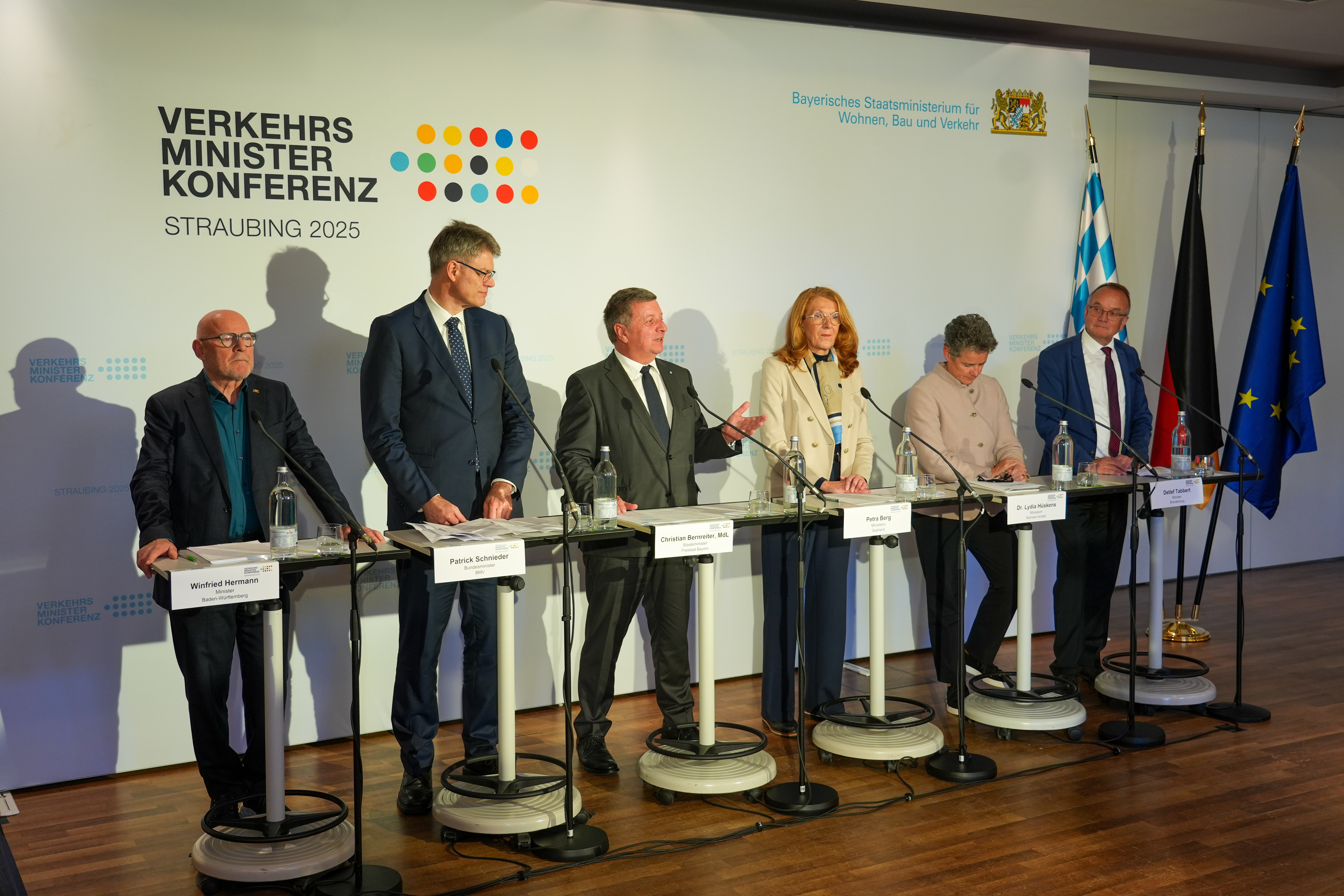 Die Verkehrsministerkonferenz (VMK) am 29. und 30. Oktober 2025 in Straubing unter dem Vorsitz von Bayerns Verkehrsminister Christian Bernreiter hat die volle Bandbreite der drängenden Verkehrsthemen in den Fokus genommen: Die für Verkehr, Mobilität und Infrastruktur zuständigen Ministerinnen und Minister und Senatorinnen und Senatoren der Länder haben für Straße, Schiene, Luft und Wasser richtungsweisende Beschlüsse gefasst. Wesentliche Themen wurden auch mit Bundesverkehrsminister Patrick Schnieder erörtert und gemeinsam an tragfähigen Lösungen gearbeitet.