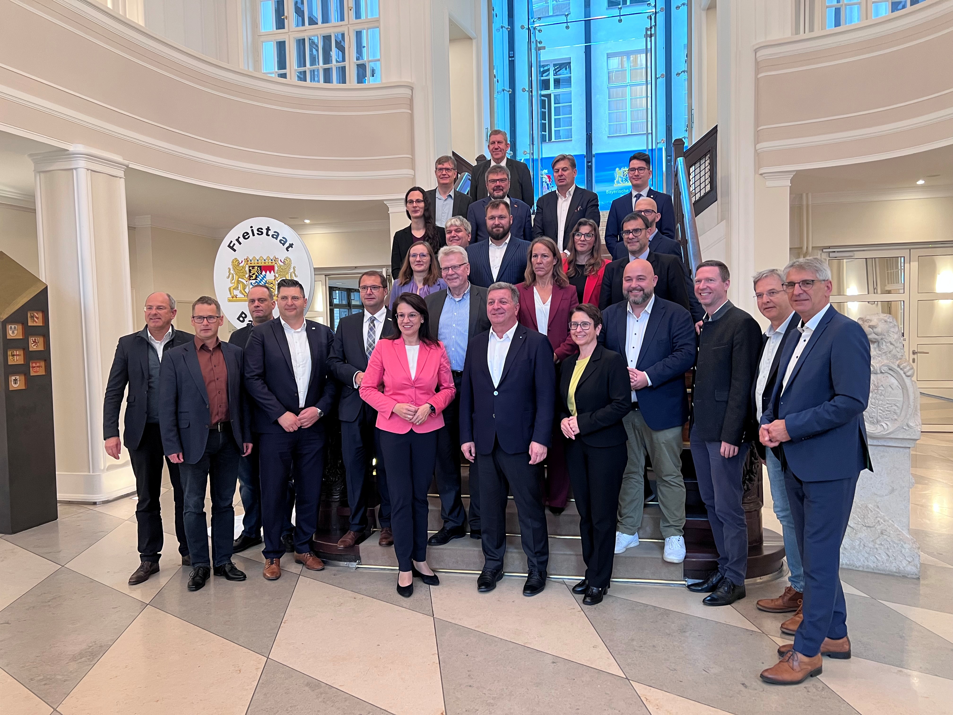 Bayerns Verkehrsminister Christian Bernreiter (vorne Mitte) diskutierte mit Vertreterinnen und Vertretern aus der Region und der Branche über die Zukunft der Franken-Sachsen-Magistrale. (Quelle: StMB)