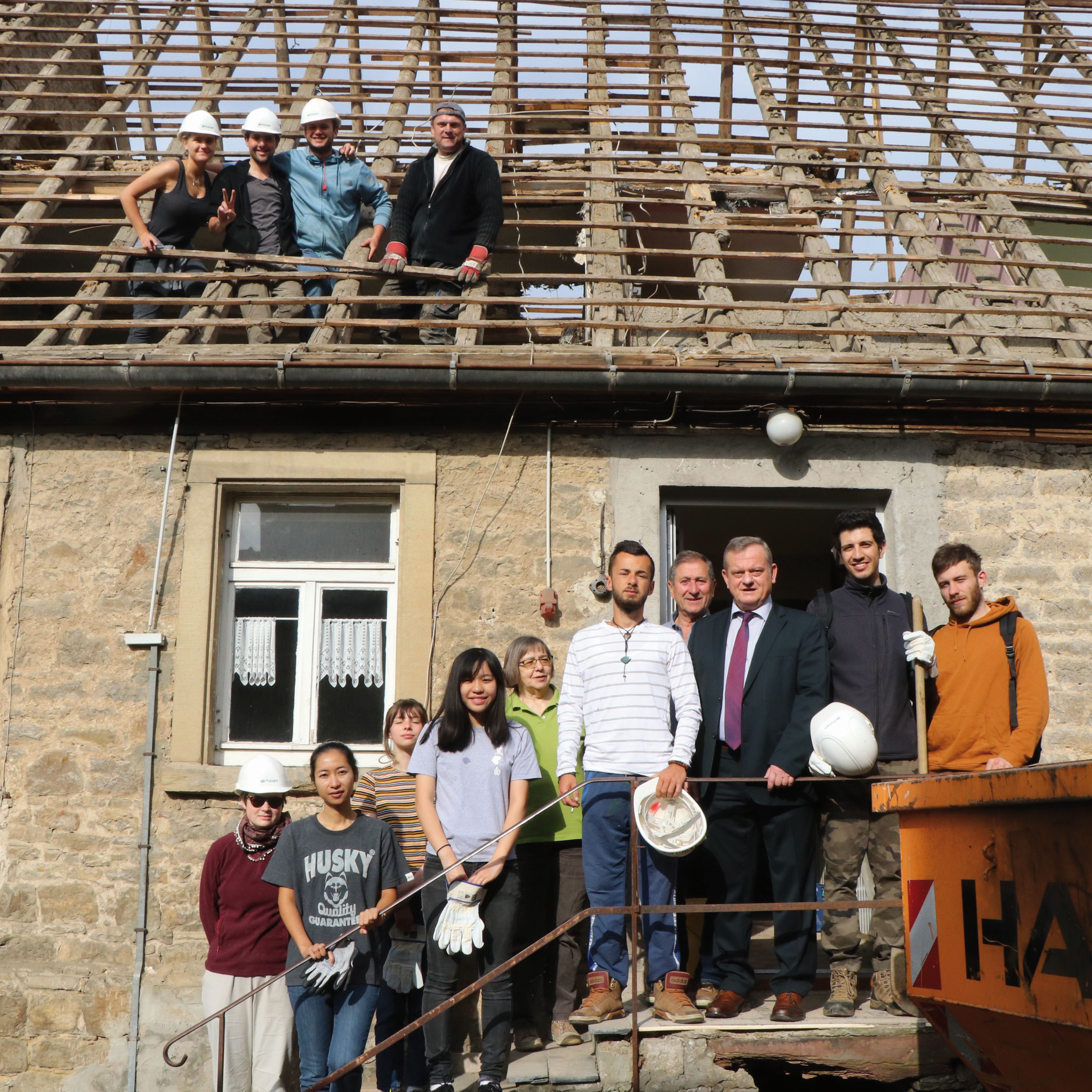 Mit tatkräftiger Unterstützung von Bürgerschaft, Asylsuchender und des Bürgermeisters entstanden in dem ortsbildprägenden Bestandsgebäude Wohnungen.