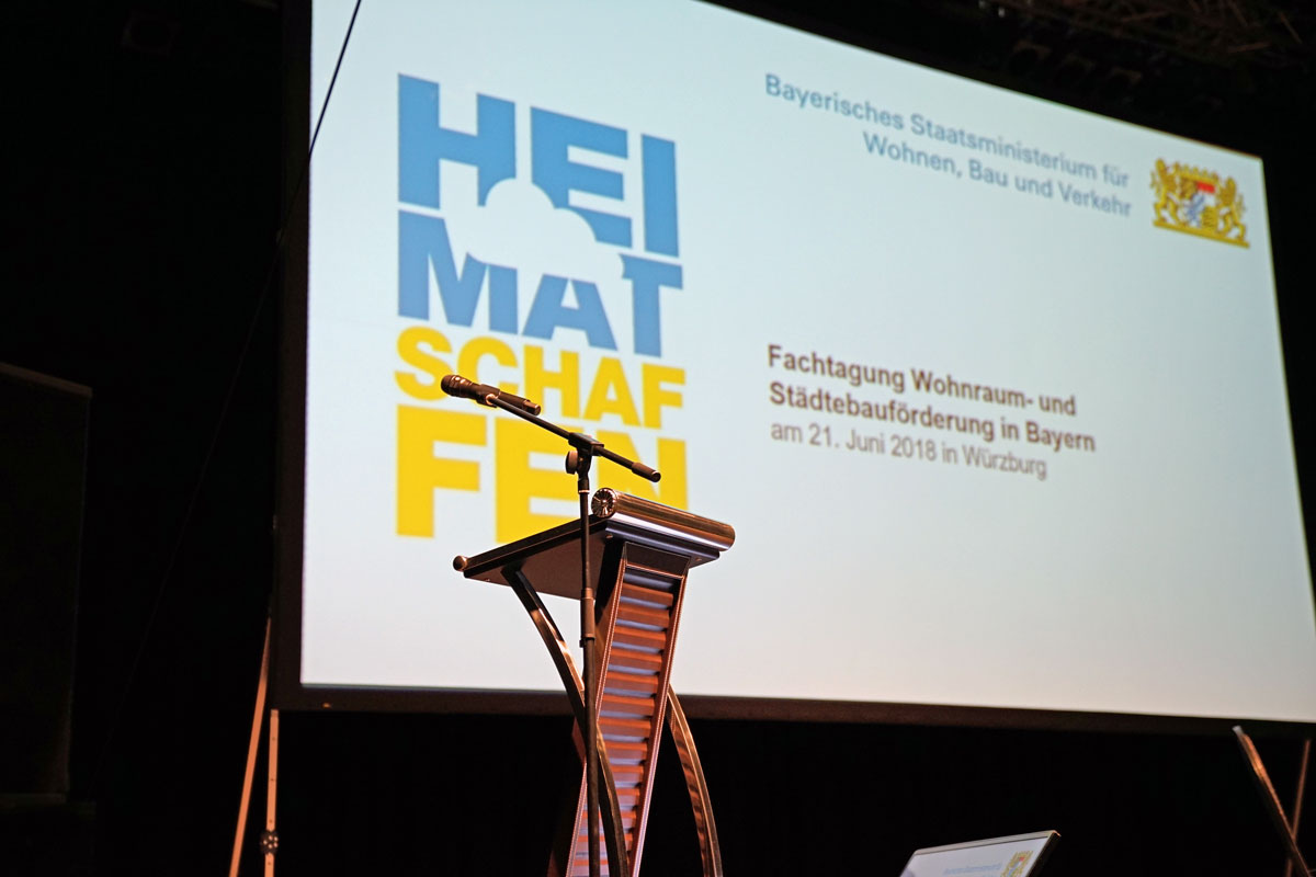 München, 25. Juni 2018 (stmb). Am 21. Juni 2018 hat in Würzburg in der Posthalle die gemeinsame Fachtagung der Wohnungsbau- und Städtebauförderung in Bayern stattgefunden. Zu der Veranstaltung unter dem Titel "Heimat schaffen" waren über 400 Teilnehmerinnen und Teilnehmer, insbesondere Bürgermeister, Abgeordnete, Vertreter von Wohnungsbauunternehmen und der Bezirksregierungen, Architekten und Fachplaner aus ganz Bayern gekommen.