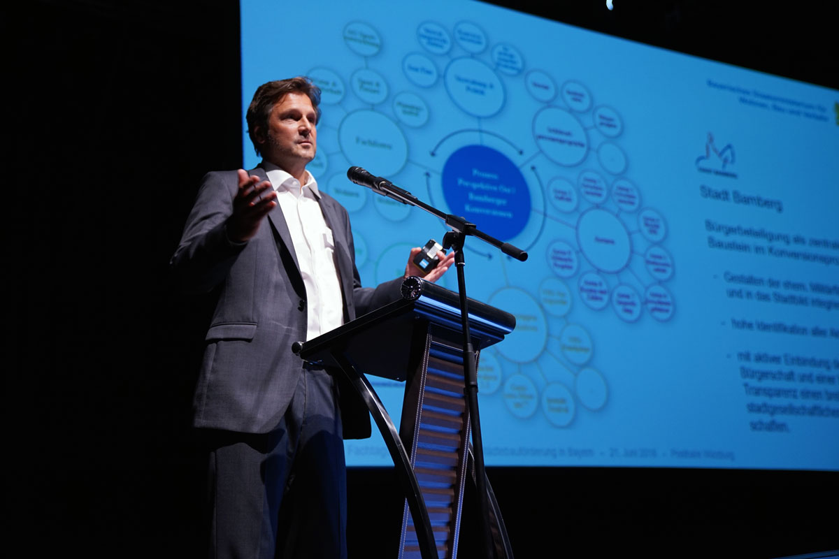 Nachdem am Vormittag allgemein die verschiedenen Facetten des Themas beleuchtet wurden, diskutierten am Nachmittag Akteure aus städtischen und ländlichen Räumen anhand von Praxisbeispielen, wie Wohnraum und gleichzeitig Heimat geschaffen werden kann und wie Orte Heimat bleiben. Vertreter bayerischer Städte und Gemeinden und der Wohnungswirtschaft hatten Gelegenheit, sich über die aktuellen staatlichen Förderungen zu informieren und untereinander auszutauschen. Moderiert wurde die Tagung von Moritz Holfelder vom Bayerischen Rundfunk.