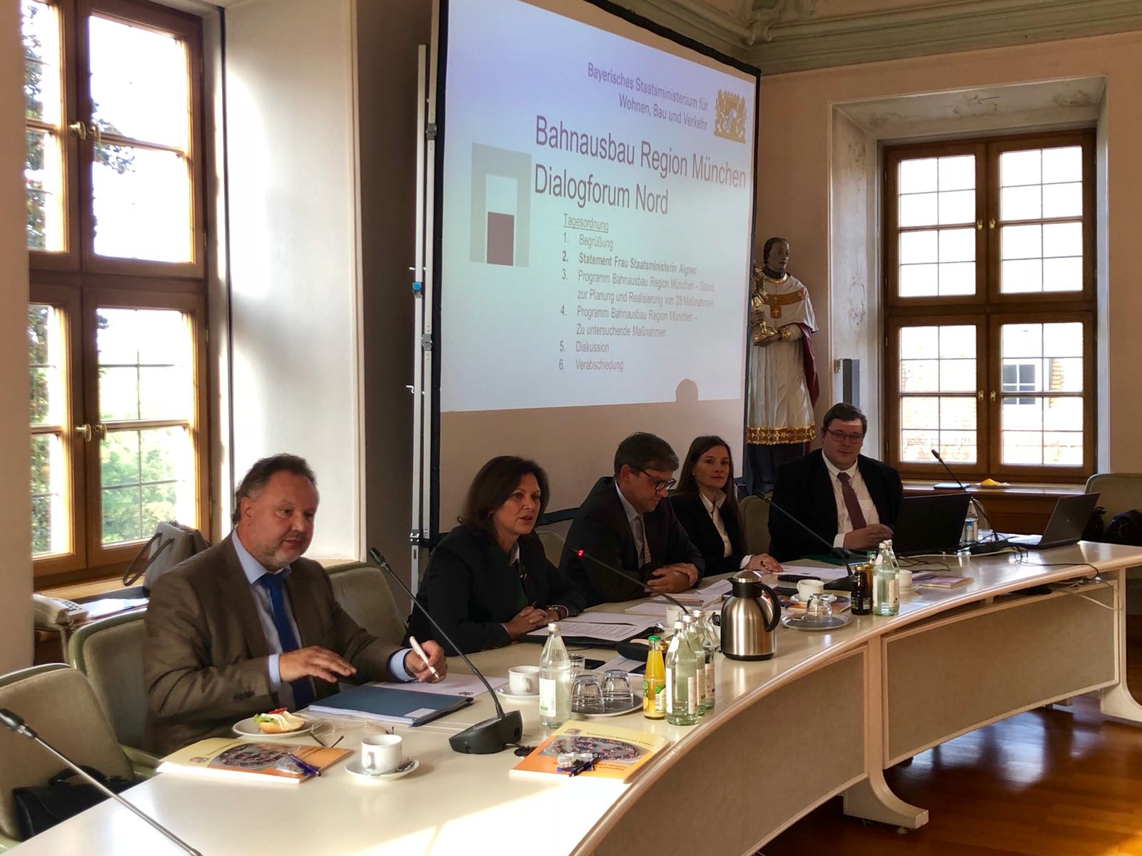 5.9.2018: Verkehrsministerin Ilse Aigner nimmt am Dialogforum Metropolregion München ÖPNV in Freising teil. Das Programm „Bahnausbau Region München“ ist der Masterplan des Bayerischen Staatsministeriums für Wohnen, Bau und Verkehr für die zukünftige Gestaltung des Schienenpersonennahverkehrs in der Metropolregion München. 28 Maßnahmen sind geplant, fünf davon im Bau oder bereits fertig.
