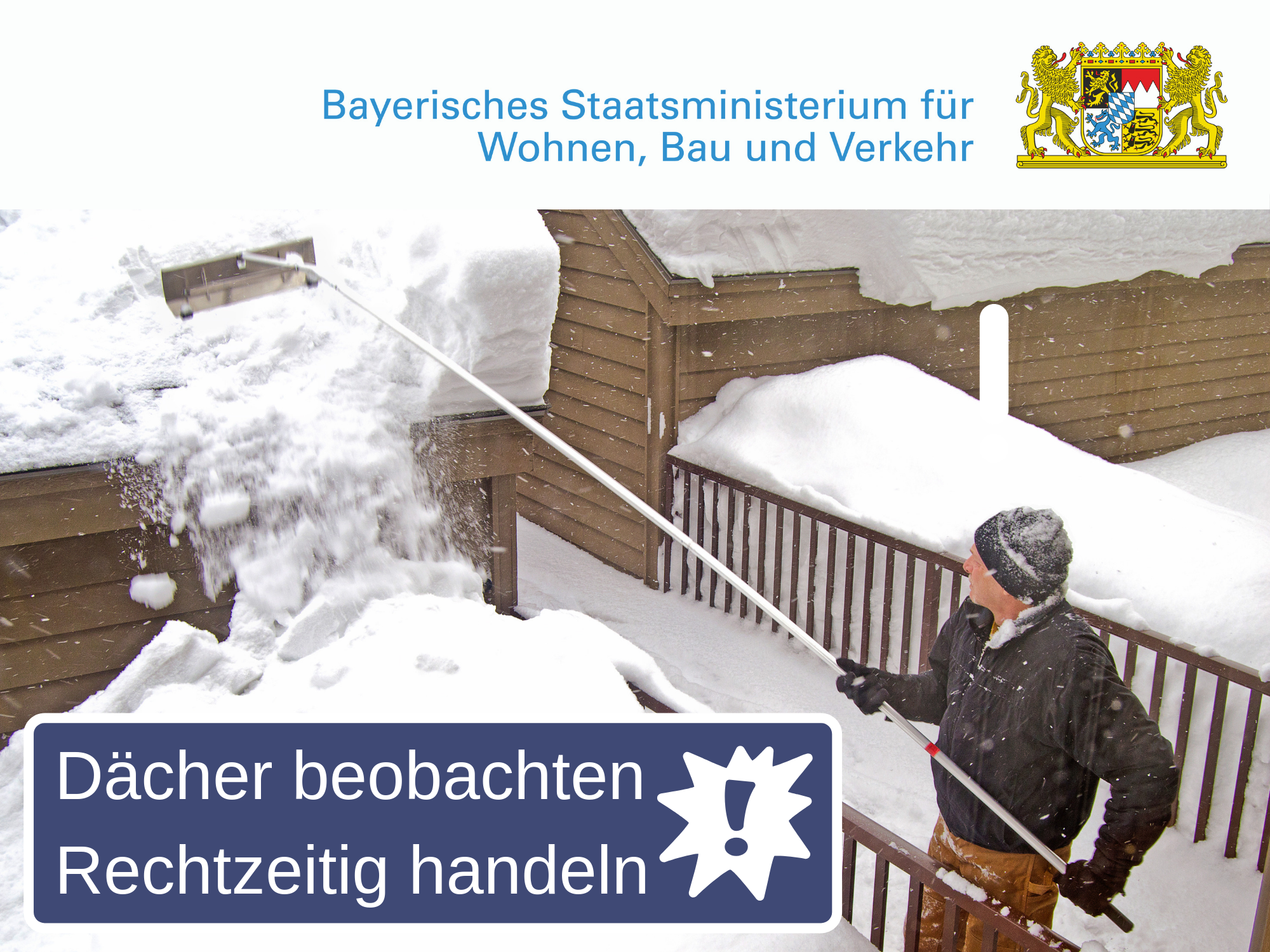 Bislang liegen dem Staatsministerium für Wohnen, Bau und Verkehr noch keine Berichte über bedenkliche Schneelasten auf den Dächern im Freistaat vor. Wir raten jedoch ausdrücklich dazu, die Gebäude in den Schneegebieten zu beobachten.