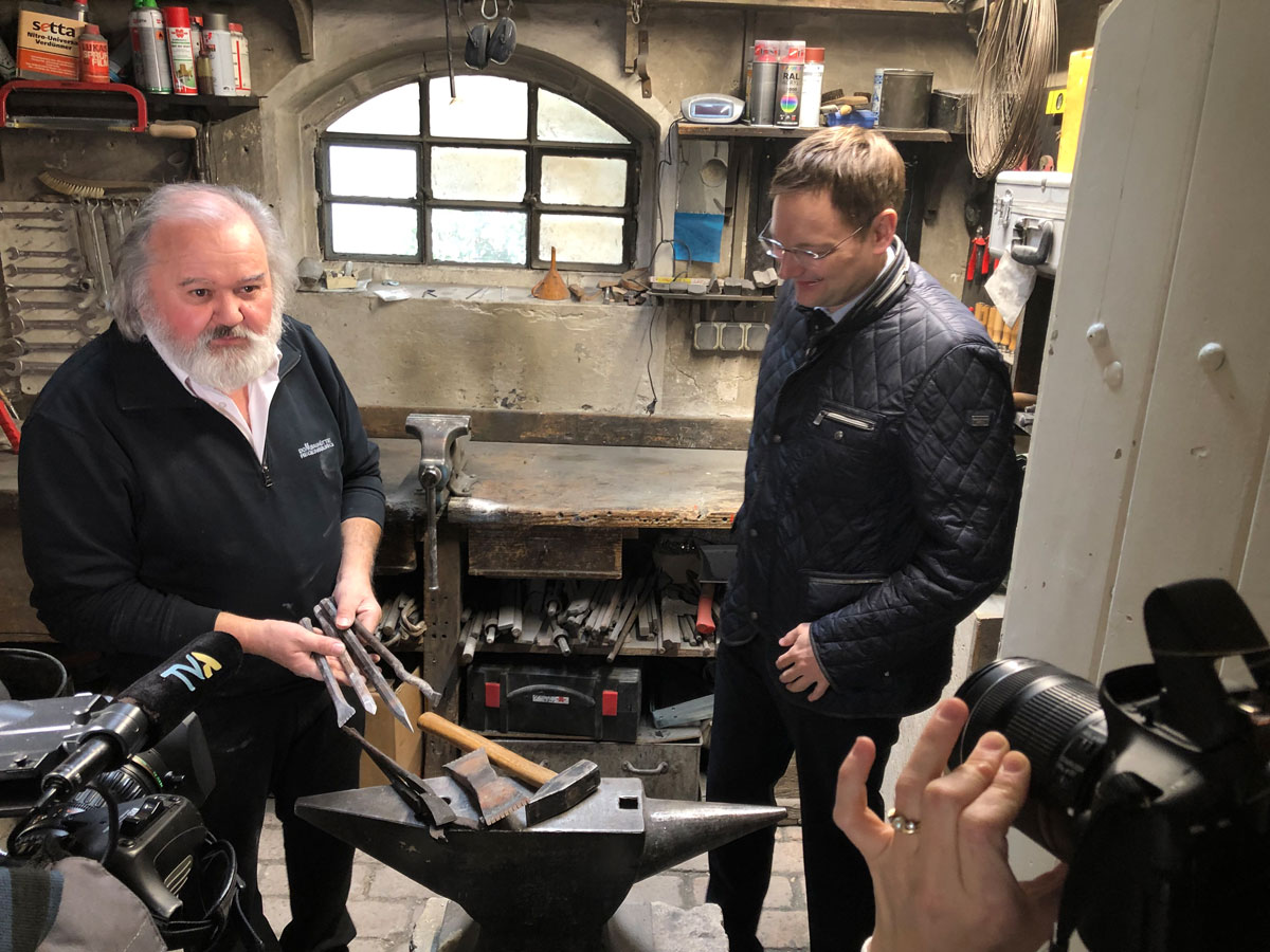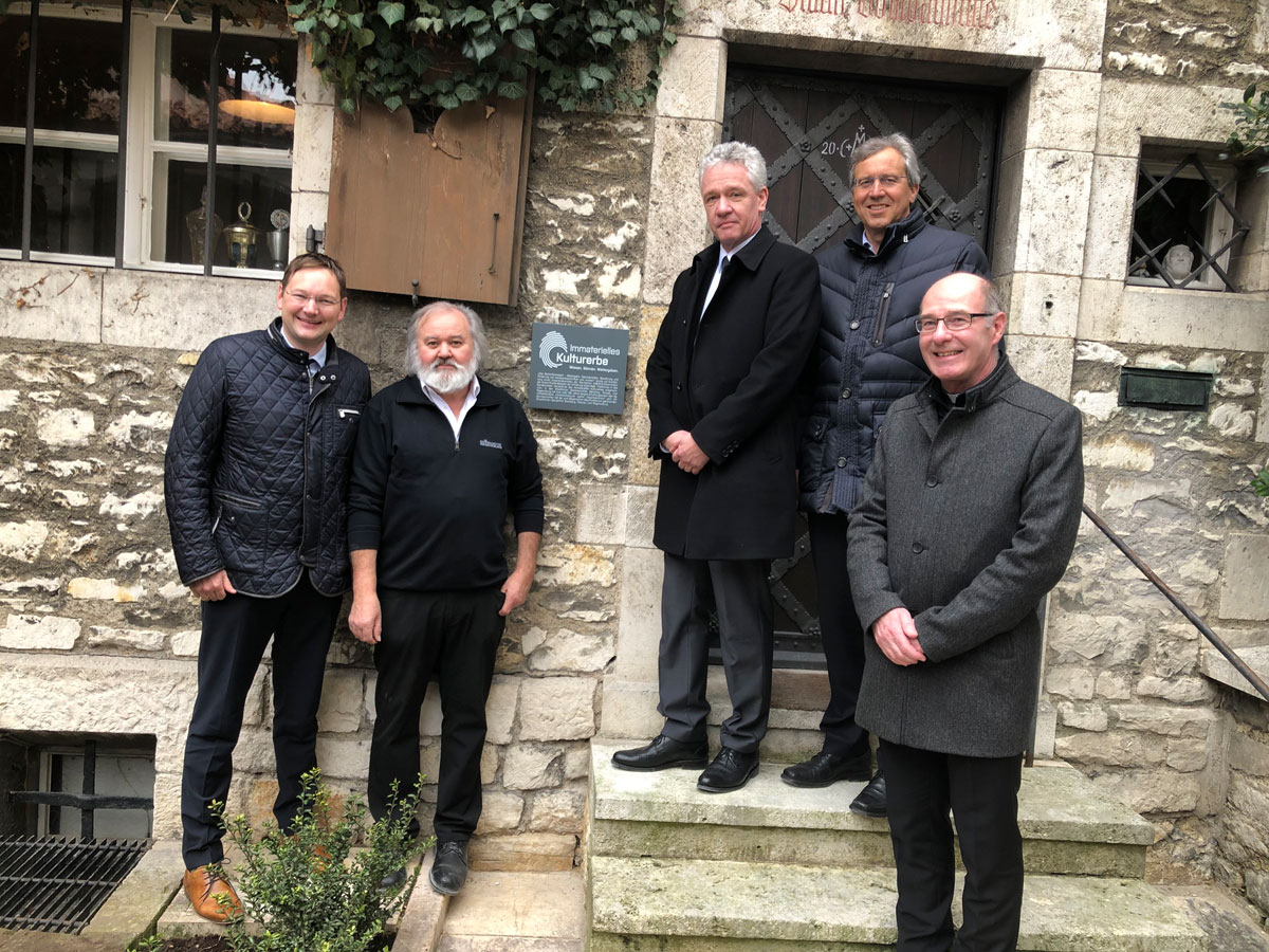 München, 28. März 2019 (stmb). Bayerns Bauminister Hans Reichhart hat heute die staatliche Dombauhütte in Regensburg besucht. Am Haupteingang hat er ein Schild mit der Auszeichnung "Immaterielles Kulturerbe" angebracht. Neben Regensburg wurden auch die staatlichen Dombauhütten der Dome zu Bamberg und Passau in das bundesweite UNESCO-Verzeichnis des Immateriellen Kulturerbes aufgenommen.