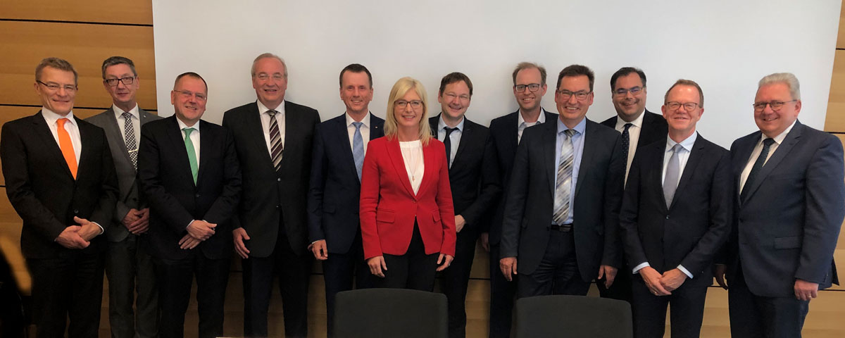 Gruppenbild des Zukunftsrats ÖPNV. Von links nach rechts: Ministerialdirektor Helmut Schütz, StMB, Andreas Mäder, Geschäftsführer VGN, Thomas Prechtl, Geschäftsführer BEG, Franz Löffler, Landrat des Landkreises Cham, Klaus-Dieter Josel, Konzernbevollmächtigter der DB AG für den Freistaat Bayern, Ulrike Scharf, MdL, Staatsminister Dr. Hans Reichhart, Dr. Bernd Rosenbusch, Geschäftsführer MVV, Hubert Fischer, 1. Bürgermeister Krumbach, Ingo Wortmann, Geschäftsführer MVGBernd Buckenhofer, geschäftsführendes Vorstandsmitglied des Bayerischen Städtetags, Josef Brandner, Geschäftsführer BBS Brandner Bus Schwaben Verkehrs GmbH