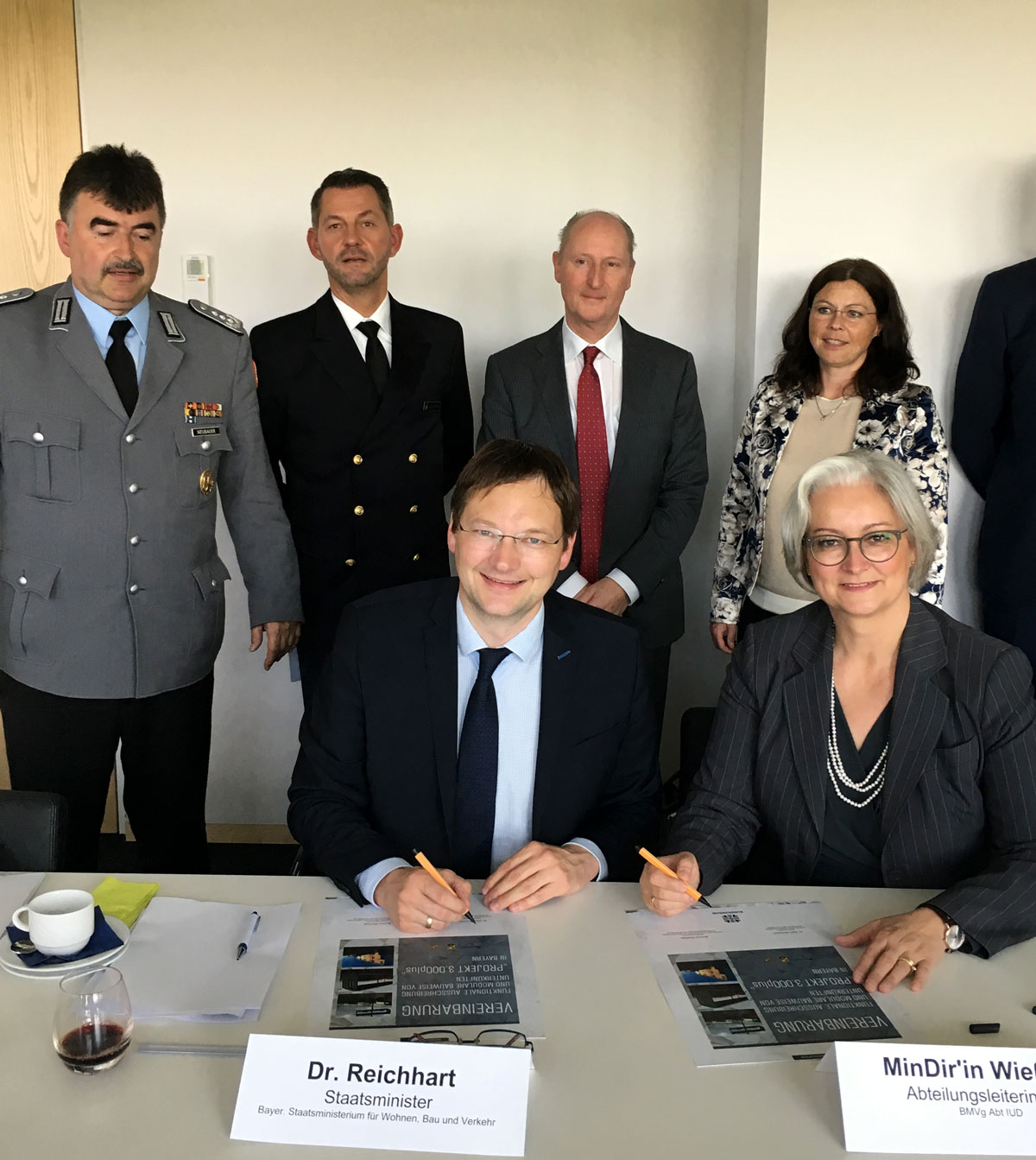 München, 24. Mai 2019 (stmb). Die Soldatinnen und Soldaten, aber auch Studierende der Bundeswehr benötigen zusätzliche Unterkünfte in Bayern. Heute haben Bayerns Bauminister Hans Reichhart und Ministerialdirektorin Barbara Wießalla, Leiterin der Abteilung Infrastruktur, Umweltschutz und Dienstleistungen im Bundesverteidigungsministerium, eine gemeinsame Vereinbarung für das "Projekt 3.000plus" unterzeichnet.
