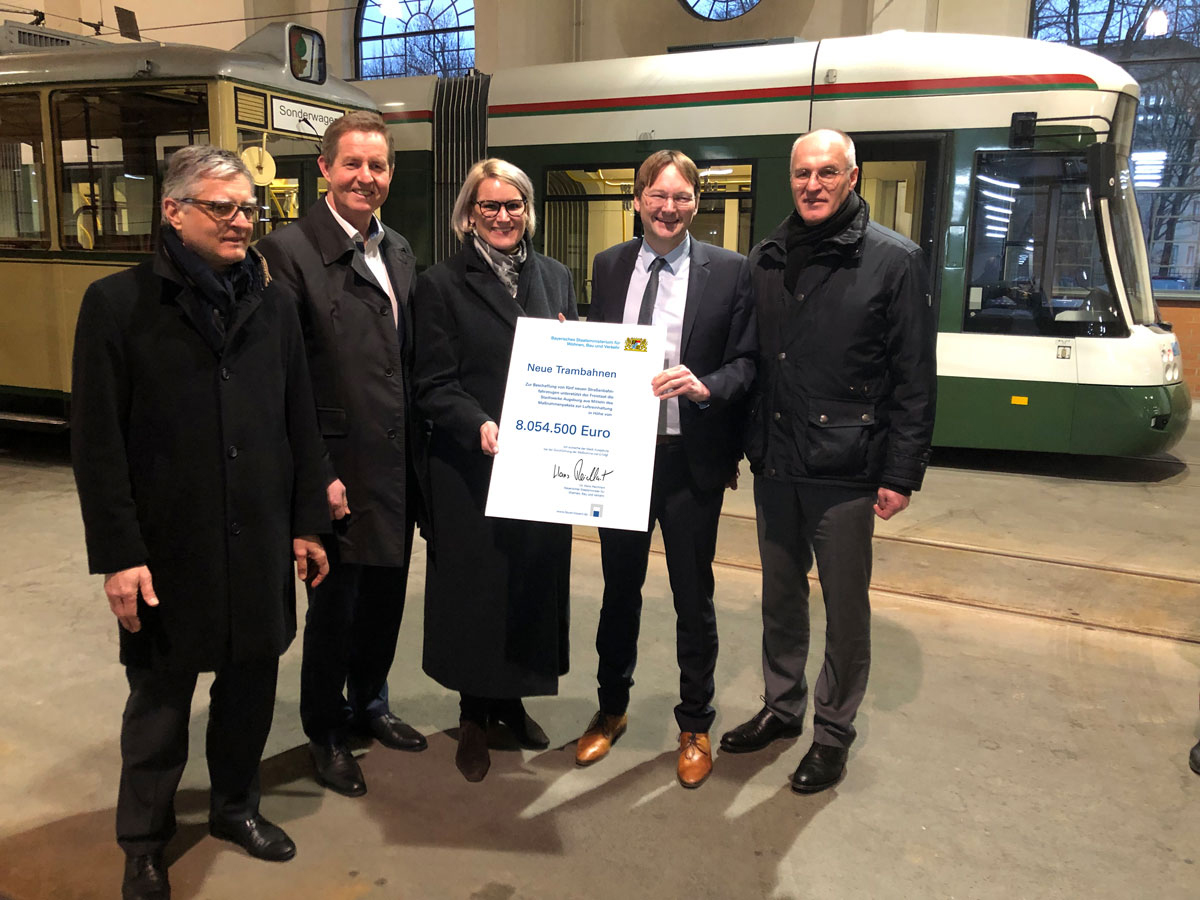 Der Freistaat Bayern unterstützt die Stadtwerke Augsburg bei der Anschaffung von fünf neuen Straßenbahnen mit rund acht Millionen Euro. „Mit einem noch attraktiveren ÖPNV wollen wir erreichen, dass die Menschen diese Angebote annehmen“, sagte Verkehrsminister Hans Reichhart bei der heutigen Übergabe des Förderbescheides an Oberbürgermeister Dr. Kurt Gribl und den Geschäftsführer der Stadtwerke Augsburg, Dr. Walter Casazza.