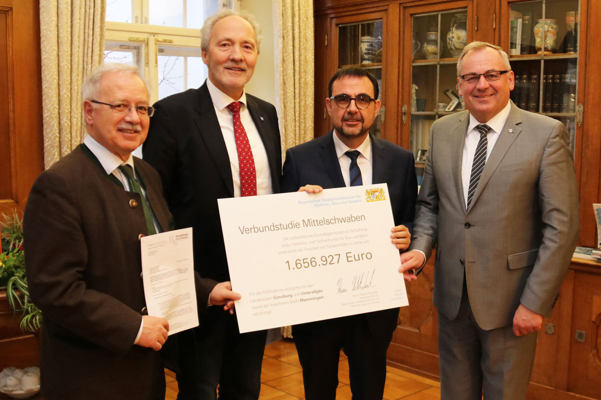 Bayerns Verkehrsstaatssekretär Klaus Holetschek hat den Landräten der Landkreise Günzburg und Unterallgäu, Hubert Hafner und Hans-Joachim Weirather, sowie dem Oberbürgermeister der Stadt Memmingen, Manfred Schilder, den Förderbescheid für die Verbundstudie überreicht.