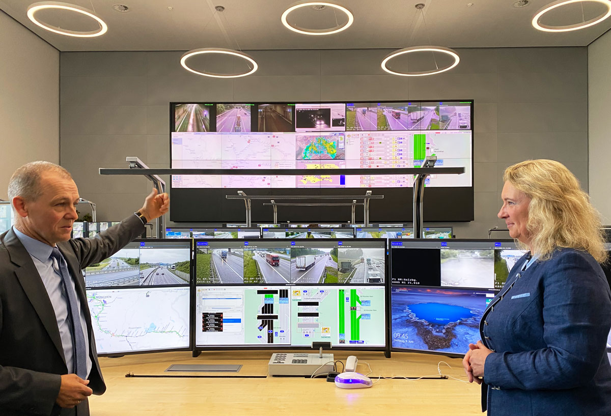 Die Verkehrs- und Betriebszentrale im Münchner Norden ist zwischen 2015 und 2019 neu gebaut und mit modernster Technik ausgestattet worden. Rund um die Uhr überwachen insgesamt 34 so genannte Operatoren den Verkehr auf den über 1.200 Kilometern Autobahn in Südbayern. Ministerin Schreyer: „Durch dieses intelligente Verkehrsmanagement erhöhen wir die Verkehrssicherheit und verbessern die Leistungsfähigkeit der Autobahnen. Damit nutzen wir die vorhandene Infrastruktur so gut wie möglich aus. Das spart Geld und Fläche, weil weniger neu gebaut werden muss.“