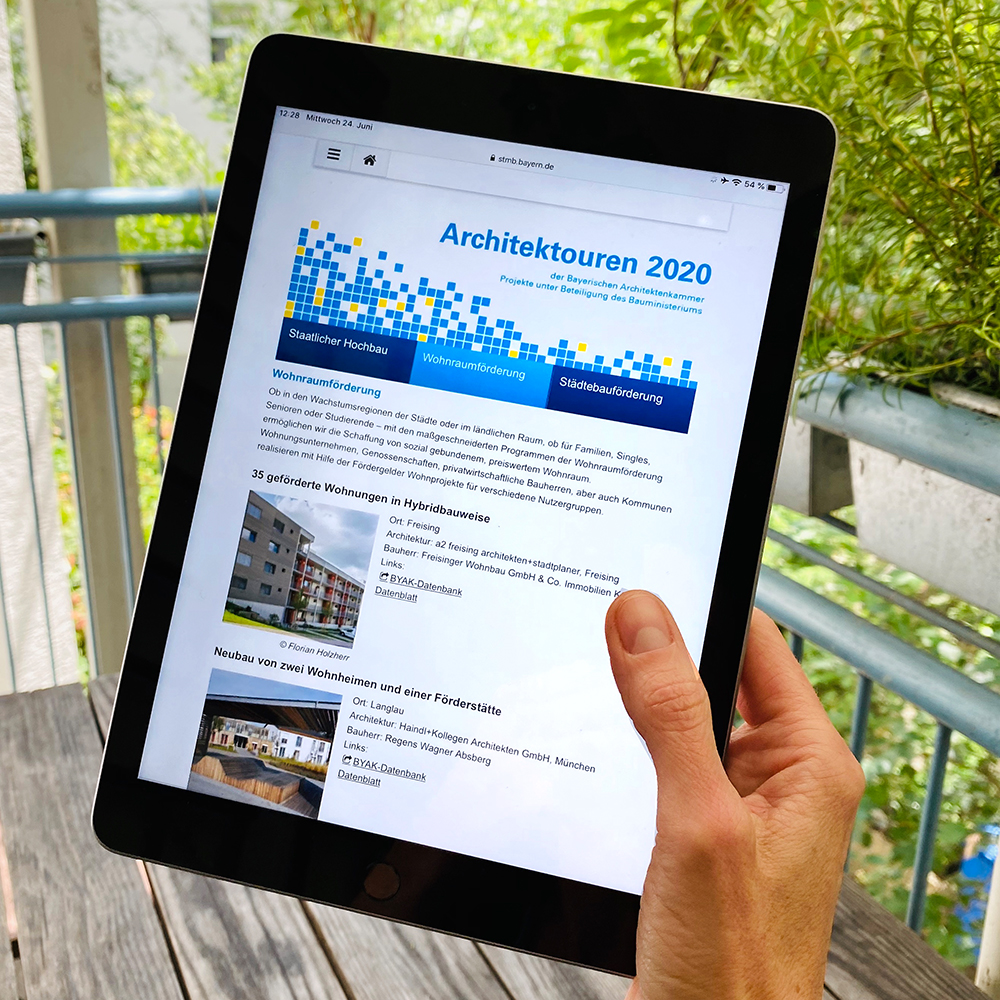Auf www.architektouren.bauministerium.bayern.de werden gelungene Beispiele aus den Bereichen Staatlicher Hochbau, Wohnraumförderung und Städtebauförderung präsentiert.