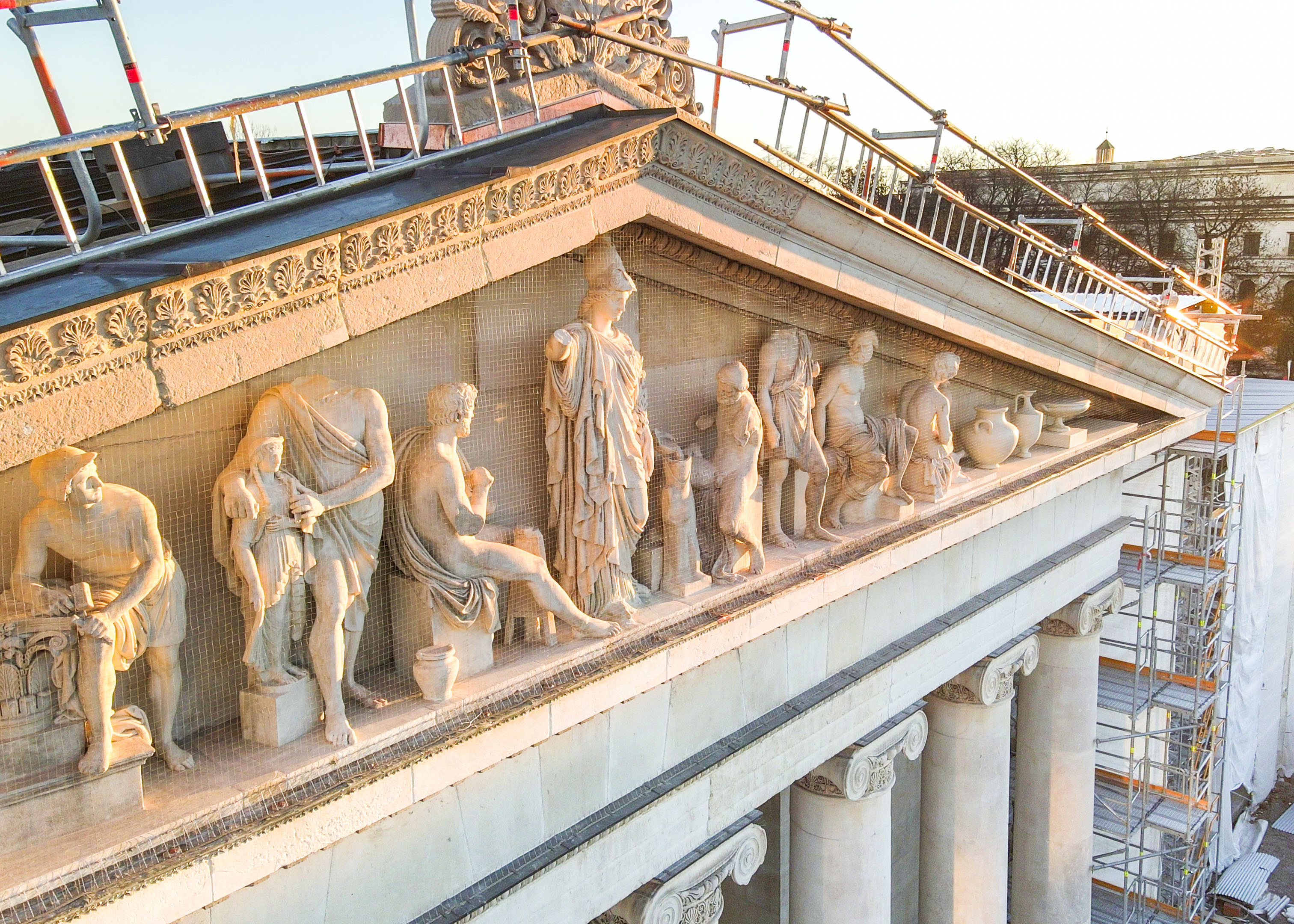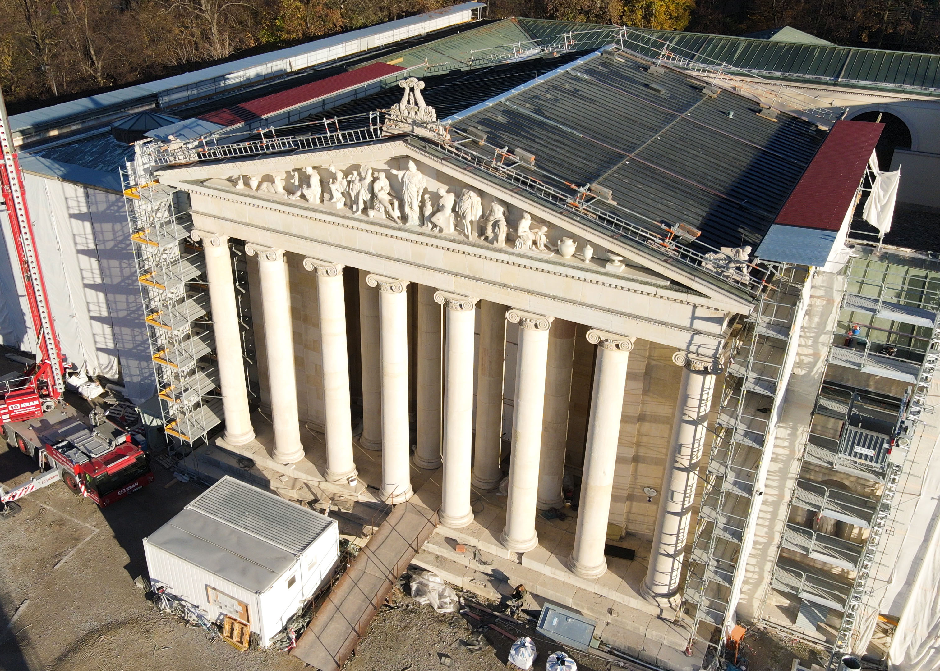 Ziemlich genau 200 Jahre nach ihrer Erbauung strahlt die Glyptothek am Münchner Königsplatz wieder wie neu. Nach dem Abbau des Gerüsts am Portikus ist wieder ein unverstellter Blick auf die sanierte Fassade des Eingangsbereichs möglich. Bayerns Bauministerin Kerstin Schreyer: „Nach der Sanierung strahlt der südliche Portikus wieder wie ein antiker griechischer Tempel. Die Staatsbauverwaltung setzt mit dem raschen Fortschritt ein Zeichen für Kunst und Kultur, das Mut macht – gerade in Zeiten von Corona.“ Die Baumaßnahmen laufen seit Anfang 2019 und sind im Termin- und Kostenrahmen. Kunstminister Bernd Sibler: „Die Glyptothek ist der älteste Museumsbau in München und ein Highlight in unserem Kunstareal. Dank der erfolgreichen Sanierung dieses Bauwerks tragen wir dazu bei, ein Stück bahnbrechender historischer Museumsarchitektur und die Heimat weltbekannter Skulpturenkunst auch für kommende Generationen zu erhalten.“
