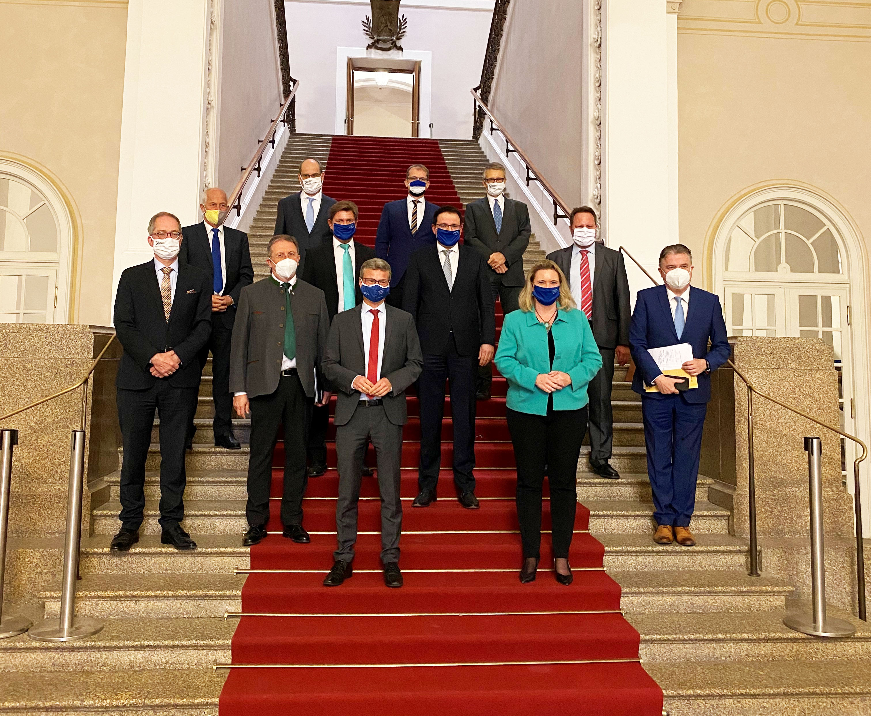 Auf dem Bild zu sehen: Wissenschaftsminister Bernd Sibler und Bauministerin Kerstin Schreyer (erste Reihe) mit den Teilnehmern des Runden Tisches im Bayerischen Landtag.