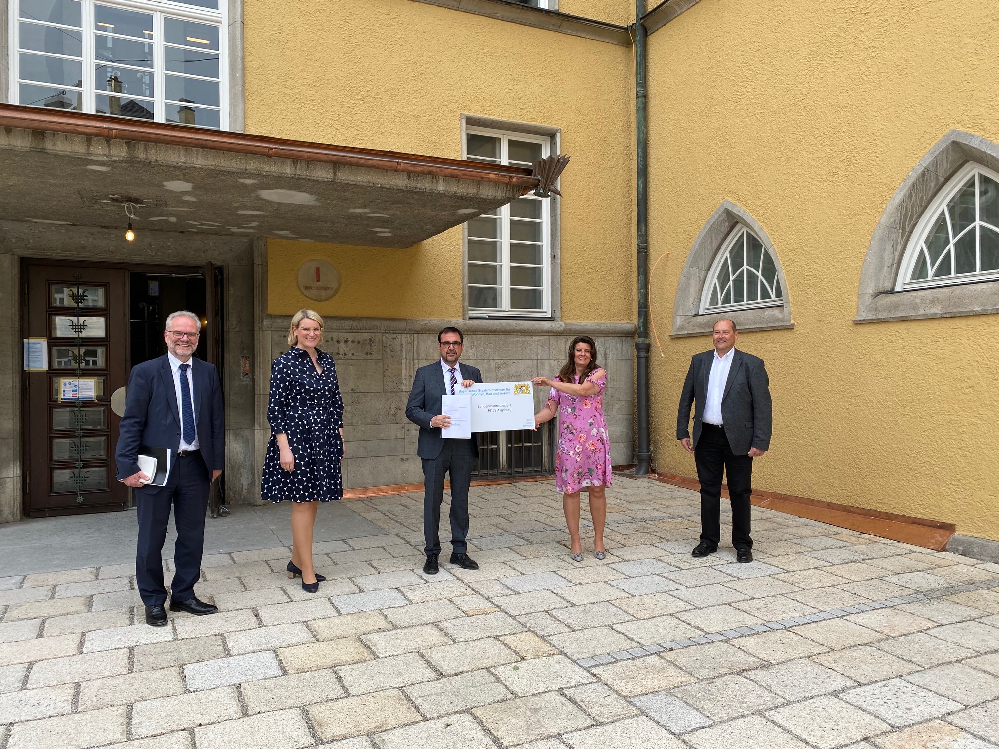 Gruppenfoto (v.l.): Regierungspräsident Dr. Erwin Lohner, die künftige Oberbürgermeisterin Eva Weber, Baustaatssekretär Klaus Holetschek, Eigentümerin Trixi Lorenz und Ulrich Blickle, Leiter des Staatlichen Bauamts Augsburg (Foto: StMB).