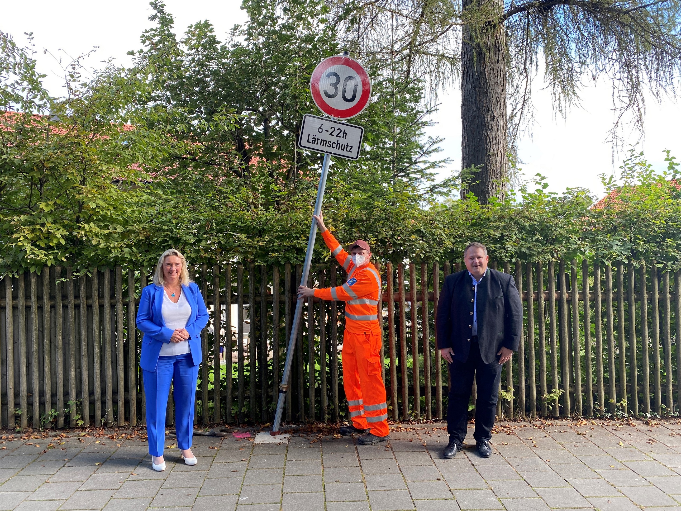 Verkehrsministerin Kerstin Schreyer, Martin Burgmayr vom Staatlichen Bauamt Freising und Schäftlarns Bürgermeister Christian Fürst stellen eines der acht Tempolimit-Schilder auf (Quelle: StMB)