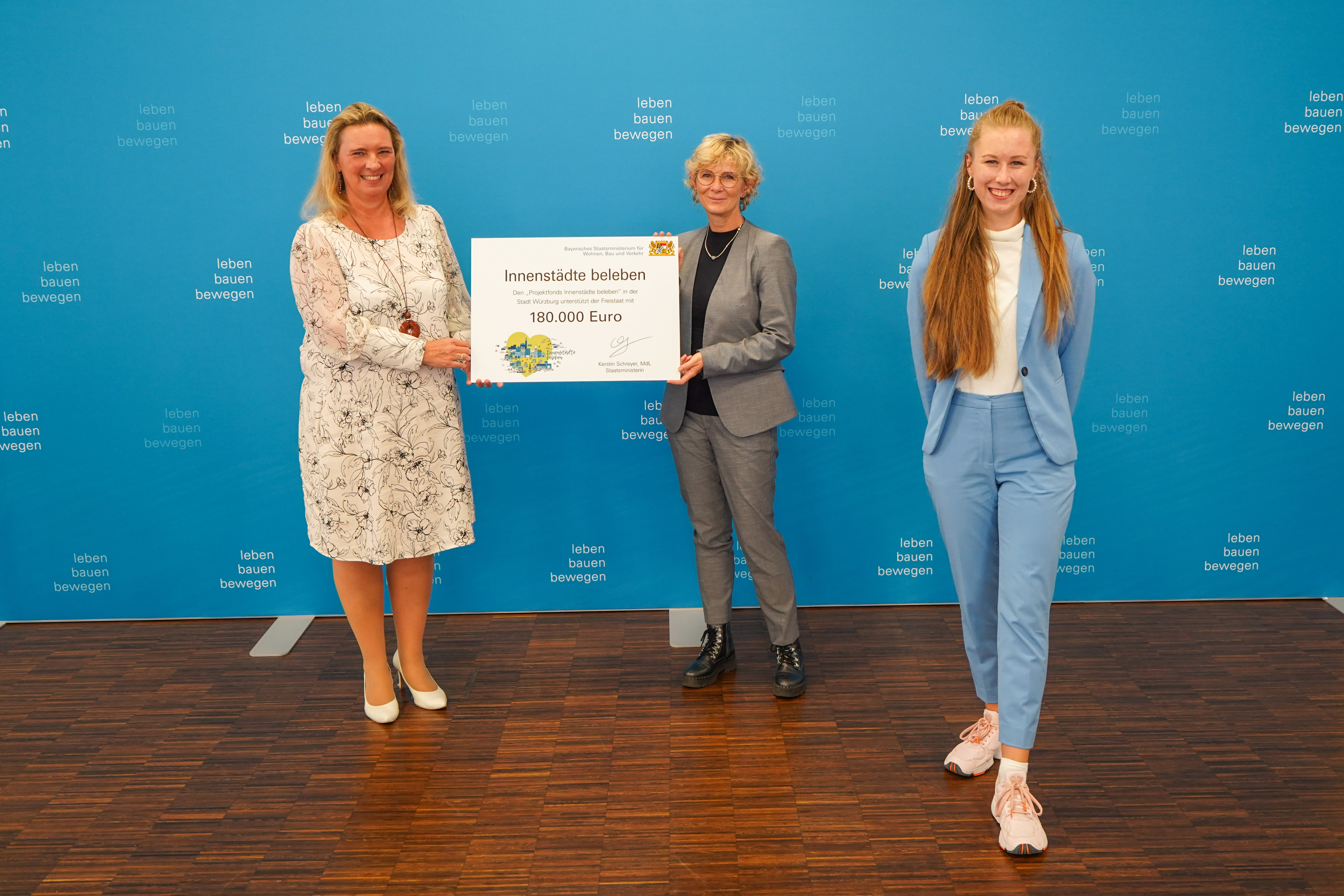 Das Bauministerium hat heuer einmalig 100 Millionen Euro für den Sonderfonds „Innenstädte beleben“ bereitgestellt. Mit den Mitteln werden Städte, Märkte und Gemeinden bei der Stärkung und Erhaltung ihrer Ortskerne unterstützt. Bauministerin Kerstin Schreyer hat nun die ersten Förderbescheide überreicht: „Die Stadt Würzburg erhält für ihren ‚Projektfonds Innenstädte beleben‘ 180.000 Euro. Wir unterstützen sie damit bei der Belebung und Stärkung der Innenstadt.“