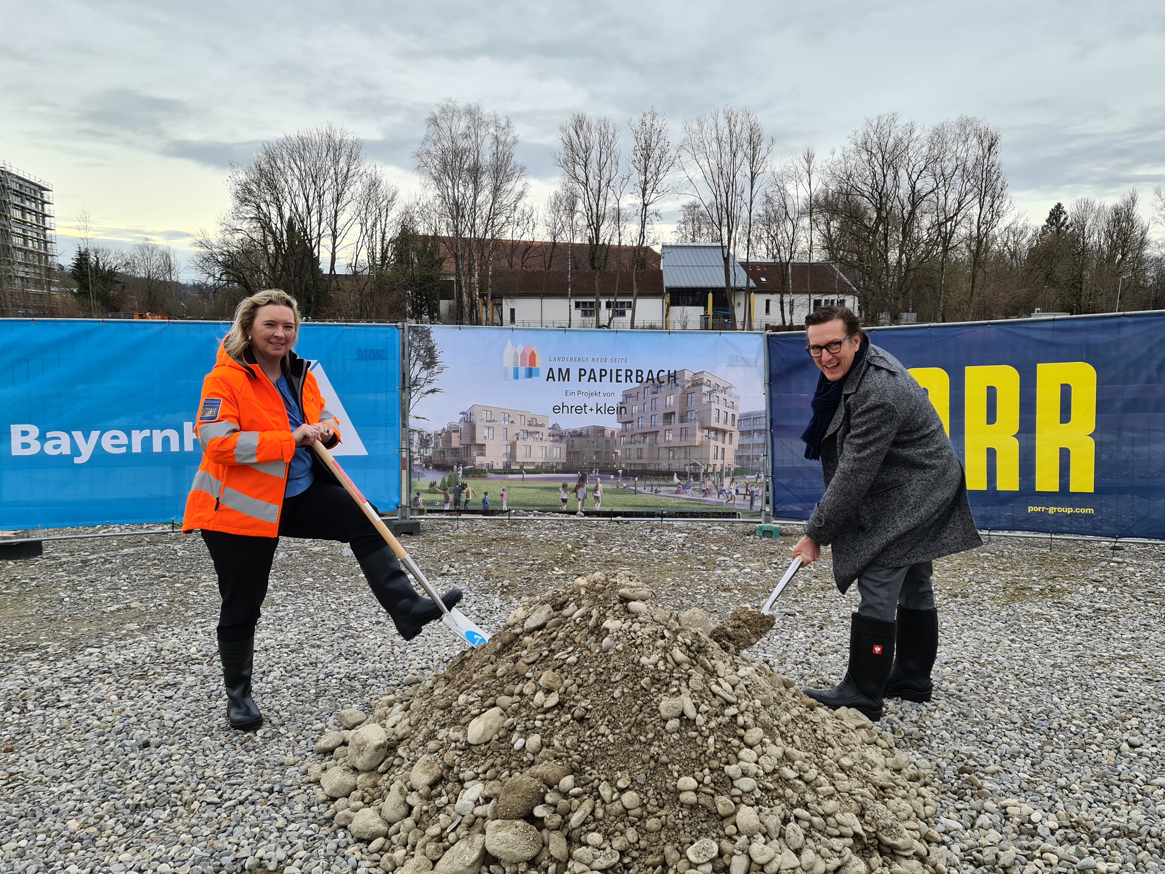 Startschuss für mehr bezahlbaren Wohnraum in Landsberg am Lech: Bayerns Bauministerin Kerstin Schreyer hat gemeinsam mit Michael Ehret, Geschäftsführer der Ehret+Klein GmbH, den Spatenstich für ein Bauvorhaben mit 56 modernen Wohnungen im neuen Stadtquartier „Am Papierbach“ gesetzt. „Ich freue mich sehr, dass wir mit der BayernHeim bezahlbaren Wohnraum in dem neuen Quartier anbieten können“, betonte Bauministerin Schreyer. „Die Wohnungen werden dauerhaft für Haushalte mit niedrigerem Einkommen zur Verfügung stehen.  Gleichzeitig sind die Wohnungen auch attraktiv, angemessen groß und barrierefrei. Bezahlbarer Wohnraum muss immer zusammen mit einer hohen Wohnqualität gedacht werden, weil Wohnen so essentiell für das Wohlbefinden des Menschen ist.“ Mitte 2023 sollen die ersten Mieterinnen und Mieter einziehen können.