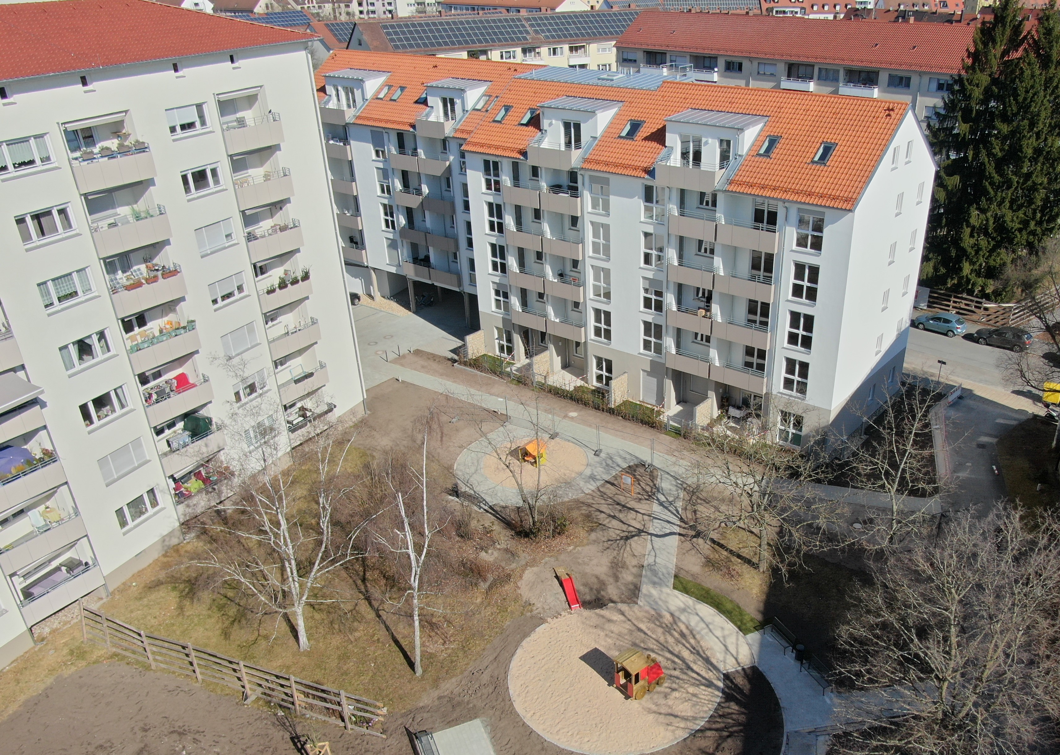 Im Nürnberger Stadtteil Gleißhammer bewirtschaftet die Siedlungswerk Nürnberg GmbH bereits rund 1.500 Wohneinheiten im Bestand. Im Rahmen einer Ergänzungsbaumaßnahme auf vormals überwiegend mit Garagenhöfen versiegelten Flächen sind nun seit 2020 in drei Bauteilen insgesamt 71 neue Wohnungen sowie 71 Stellplätze entstanden. Der Mix aus Zwei- bis Vier-Zimmer-Wohnungen bietet ein breites Angebot an modernen und barrierefreien Grundrisstypen. Im Zuge der Realisierung der Baumaßnahme wurden auch die Freibereiche neugestaltet und insbesondere die Aufenthaltsqualität im Bereich der Kinderspielplätze verbessert.
