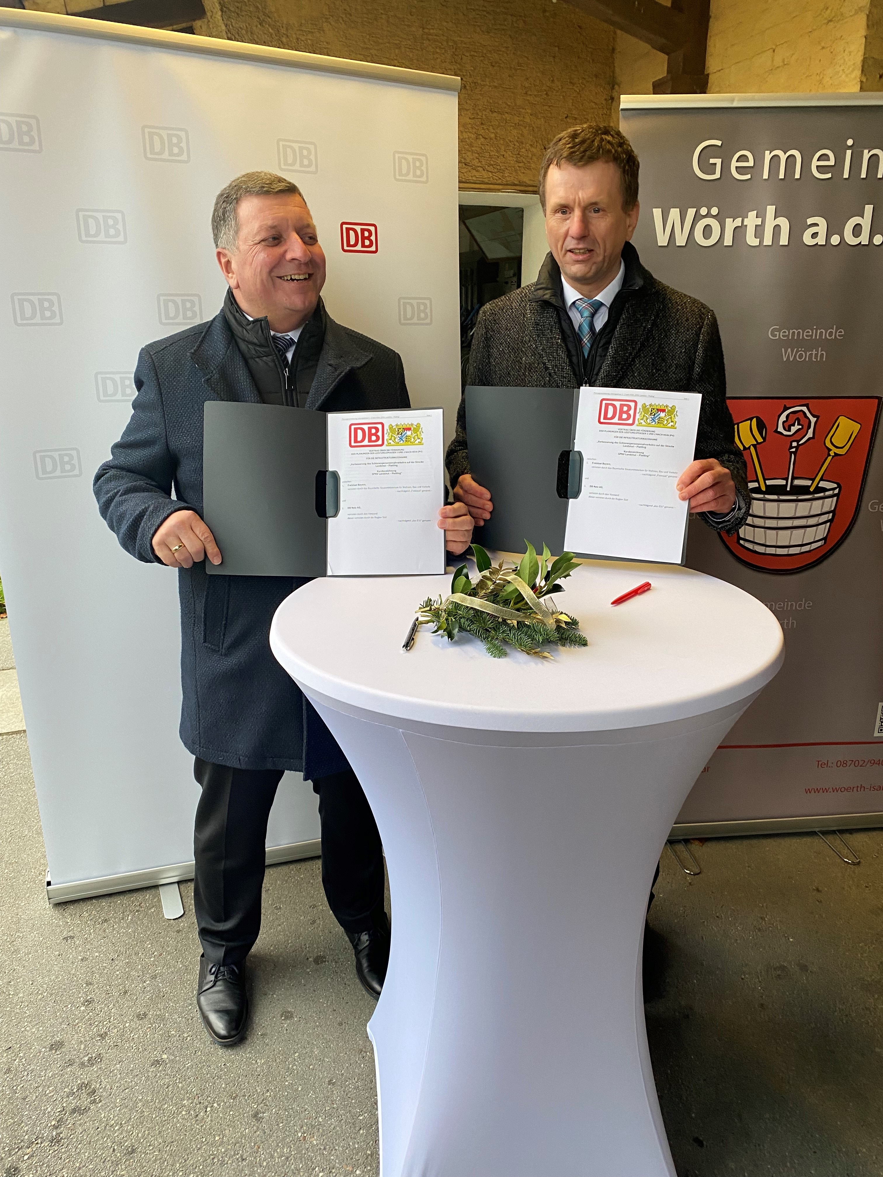 Bayerns Verkehrsminister Christian Bernreiter und Klaus-Dieter Josel, Konzernbevollmächtigter der Deutschen Bahn für den Freistaat Bayern mit den unterzeichneten Verträgen