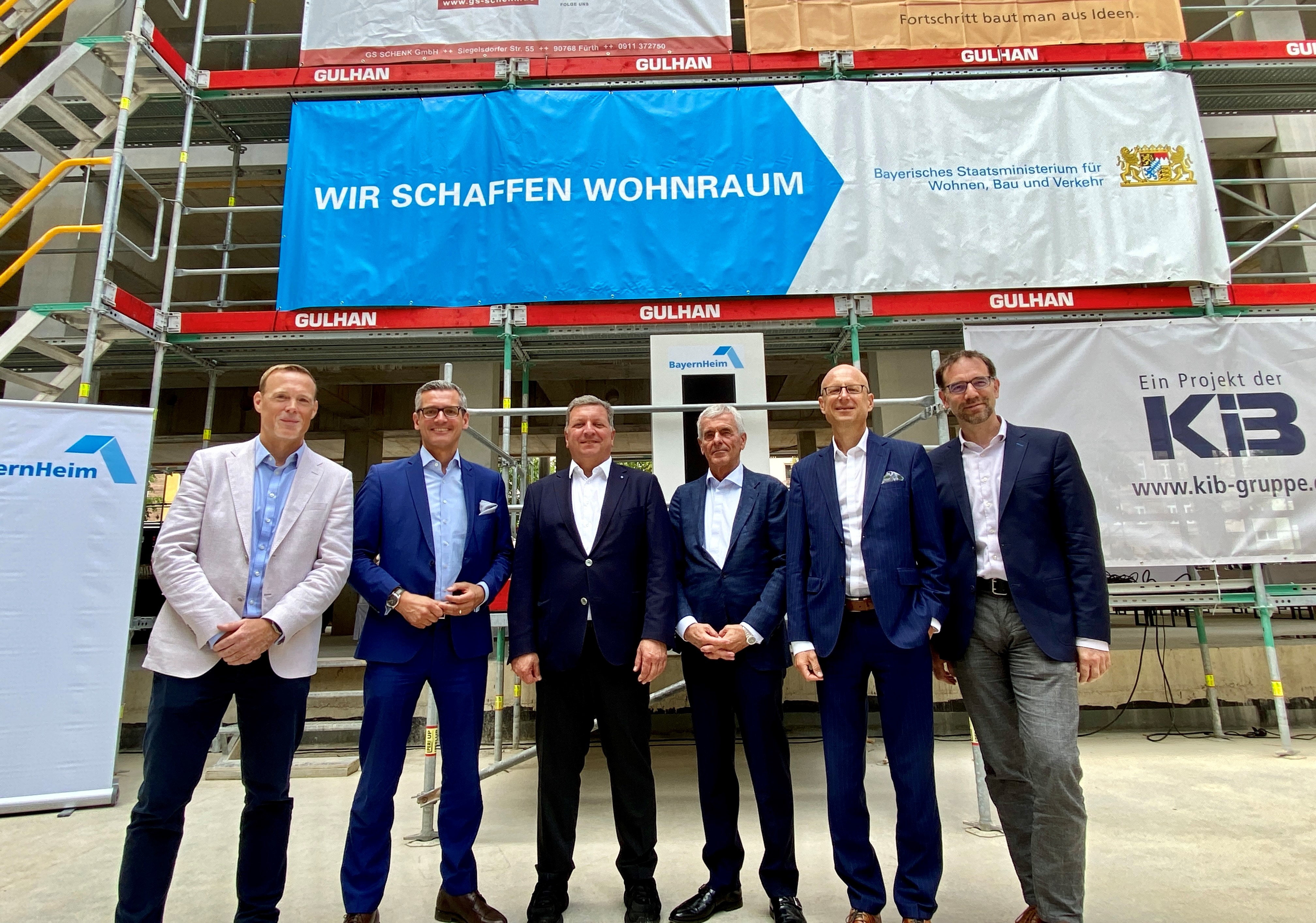 Benjamin Waeger, Geschäftsführer KIB-Gruppe, Dr. Michael Fraas, Wirtschaftsreferent der Stadt Nürnberg, Christian Bernreiter, Bayerischer Staatsminister für Wohnen, Bau und Verkehr, Richard Minartz, geschäftsführender Gesellschafter KIB-Gruppe, Ralph Büchele, Geschäftsführer BayernHeim, und Daniel Ulrich, Planungs- und Baureferent der Stadt Nürnberg. (Quelle: StMB)