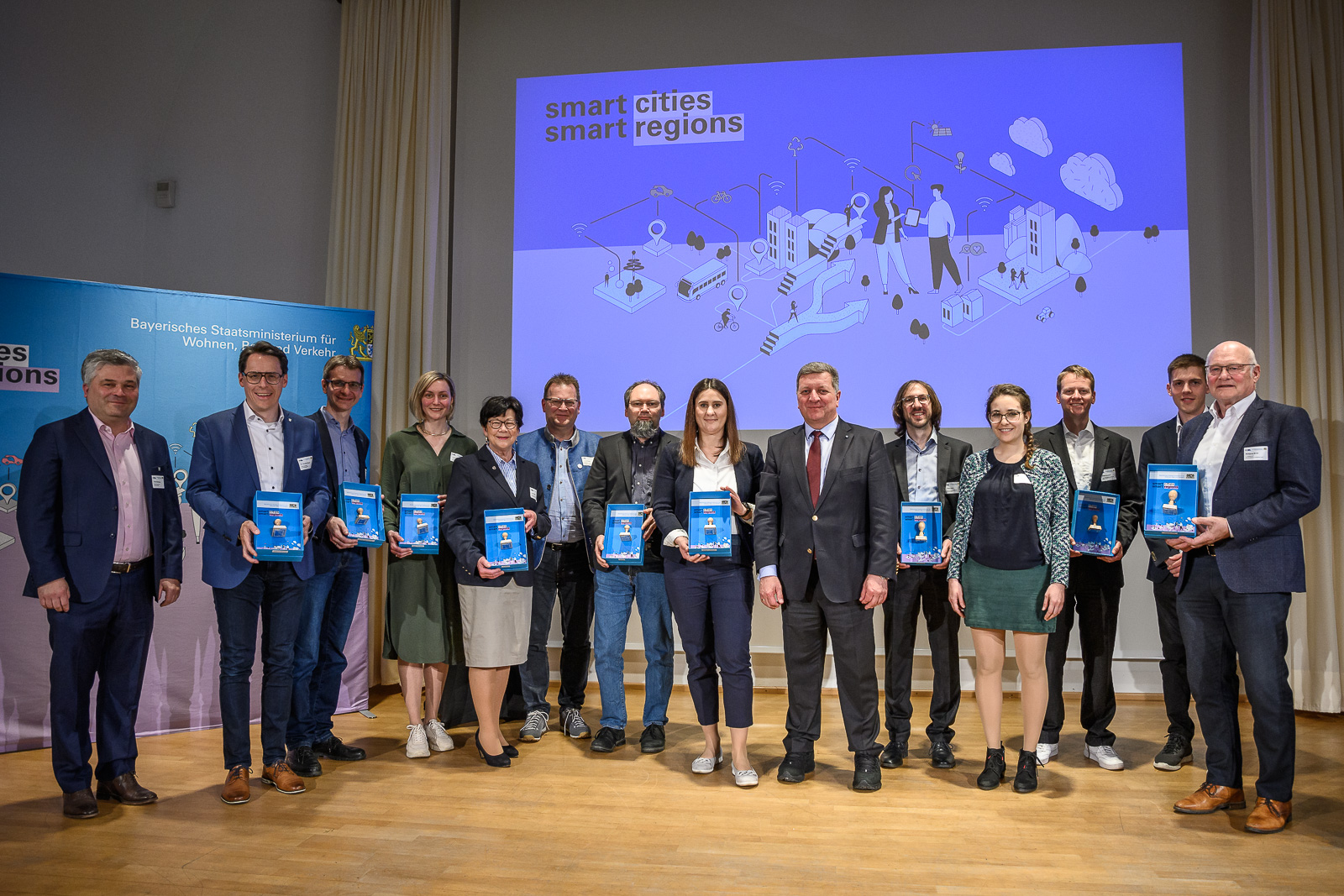 Bayerns Bauminister Christian Bernreiter (Mitte) mit den Vertreterinnen und Vertretern der Kommunen und Planungsbüros, die an „Smart Cities, Smart Regions“ teilgenommen haben. (Copyright: TN Picture / Tobias Nirschl)