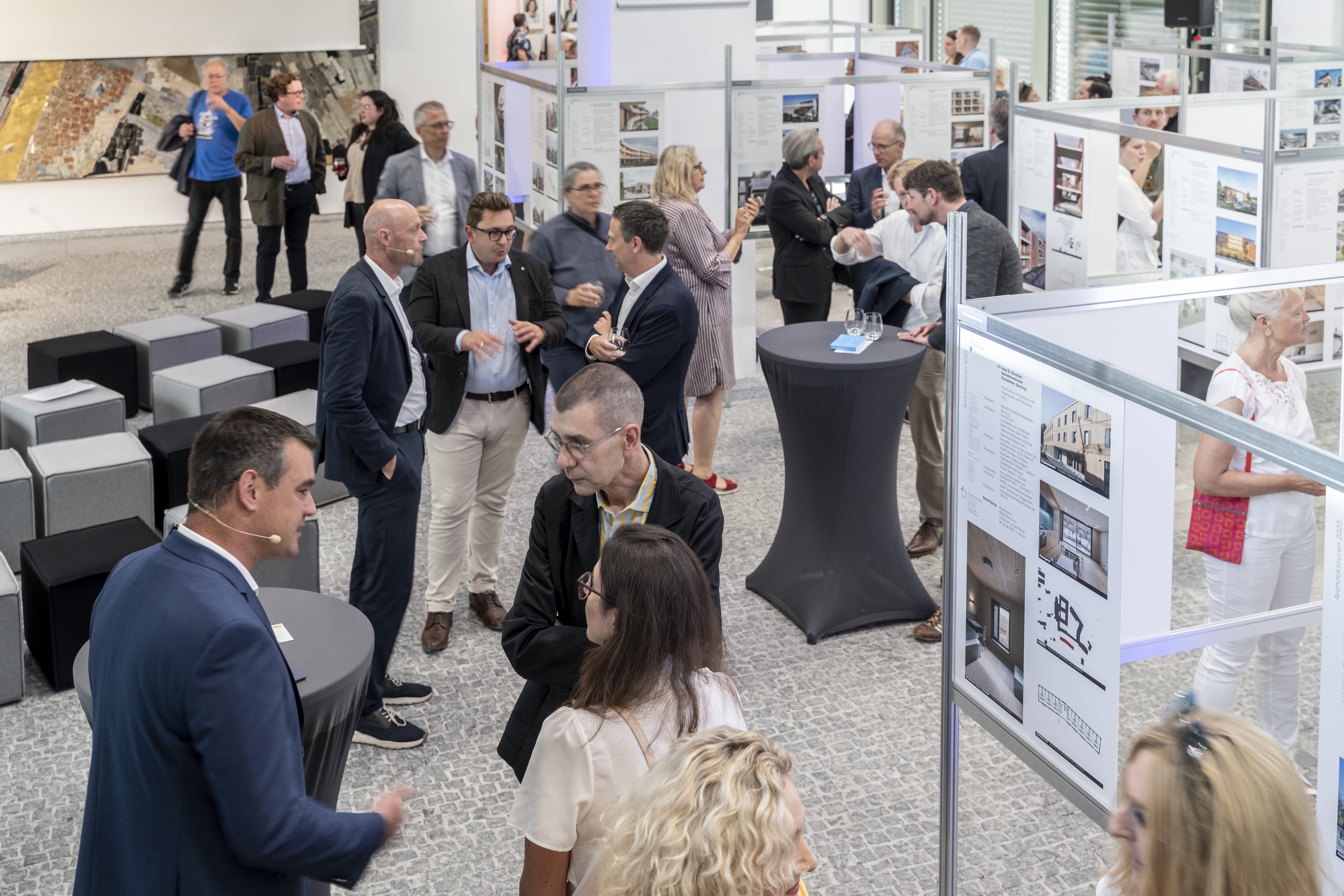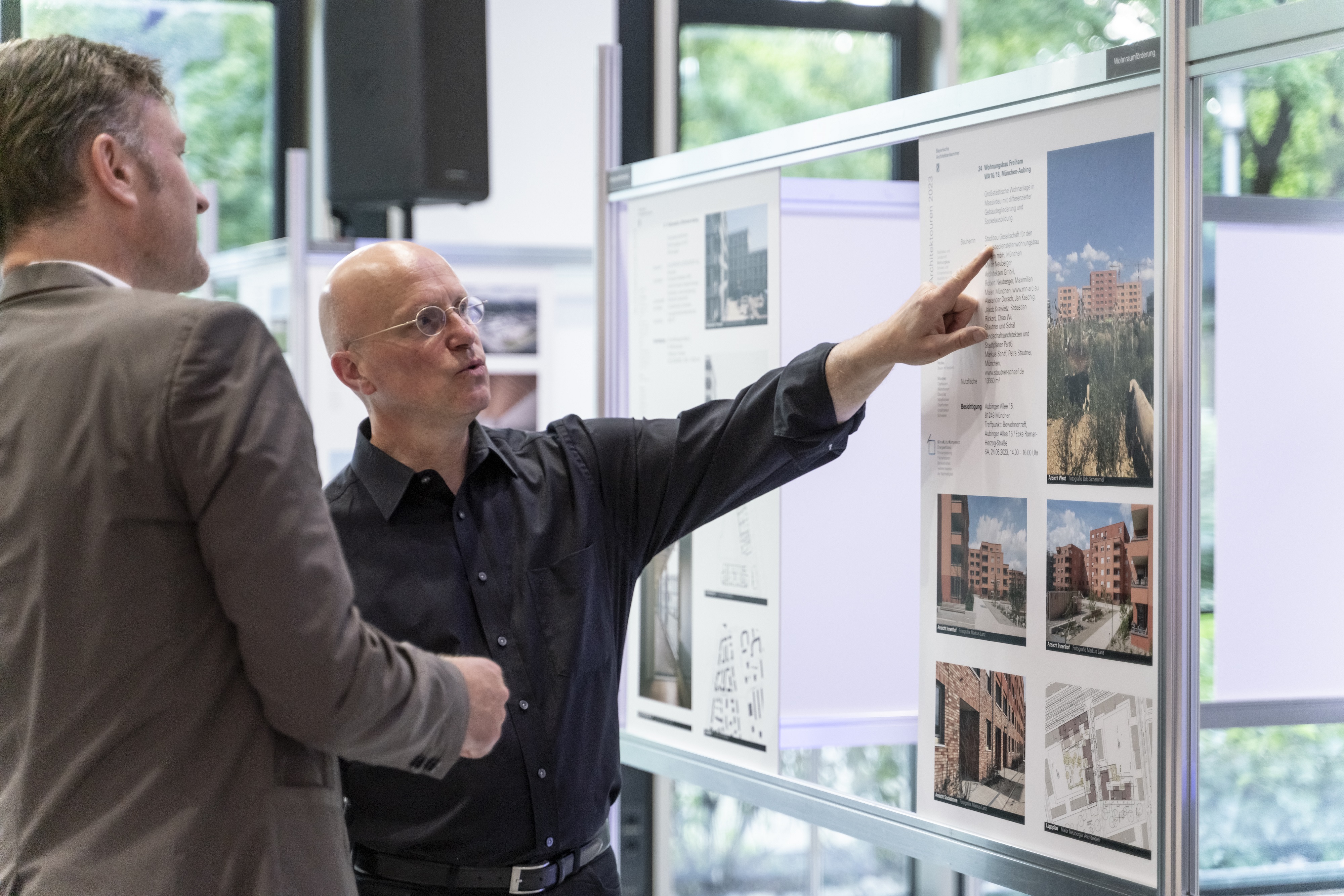 Abgerundet wurde die Ausstellungseröffnung durch zwei Fachvorträge. Der Leiter der Abteilung Kirchenstiftungen/Bau und technische Dienste am Bischöflichen Ordinariat des Bistums Eichstätt, Josef Heinl, stellte zusammen mit Eric Frisch von Dömges Architekten eine Wohnanlage für Studierende in Ingolstadt vor. Der Erste Bürgermeister der Gemeinde Utting am Ammersse, Florian Hoffmann, und Gerold Heugenhauser von WWA-Architekten München präsentierten eine Anlage mit geförderten Wohnungen in nachhaltiger Holzbauweise auf dem Schmucker Areal in Utting.