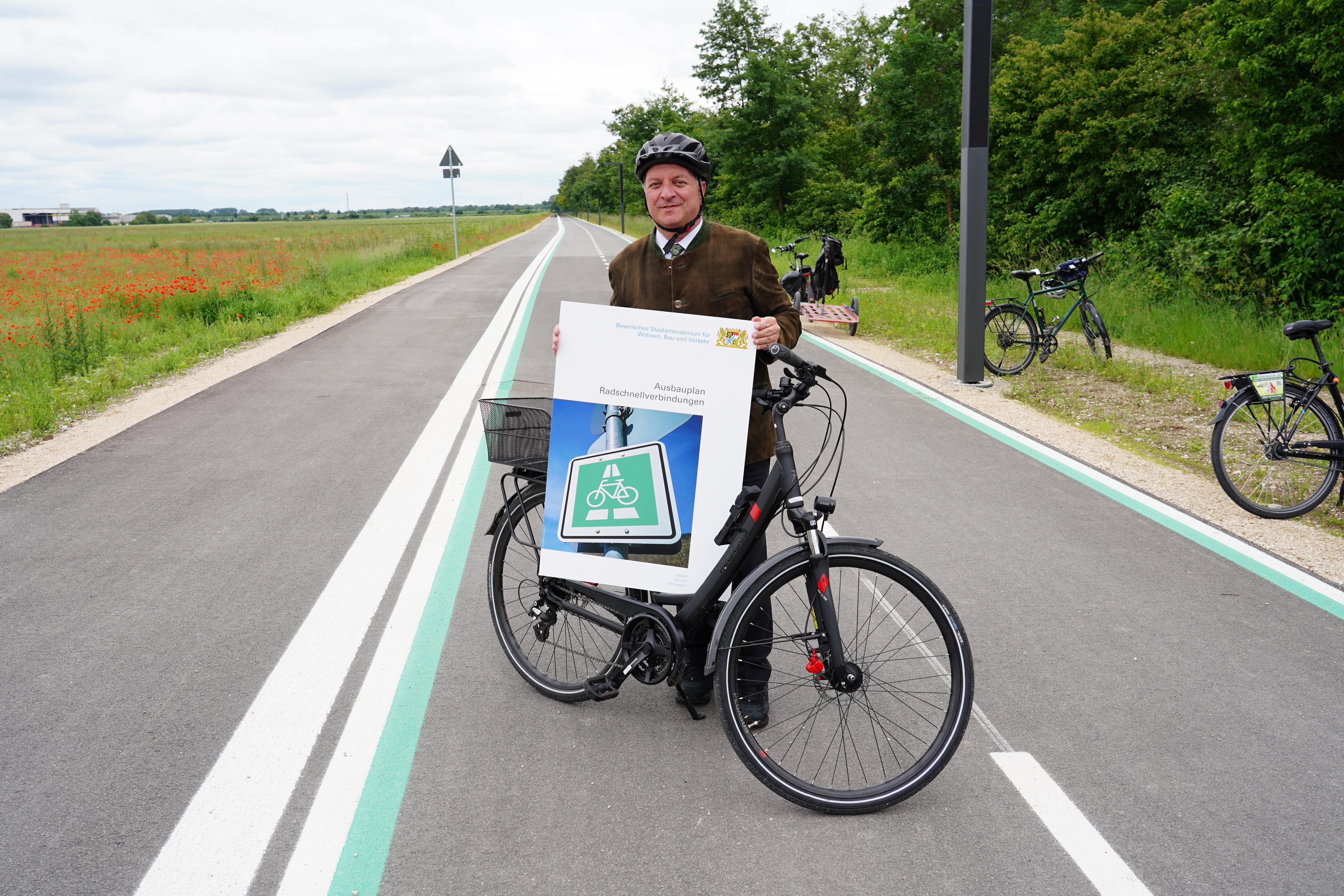 Mit dem Fahrrad schnell und direkt von A nach B: In Bayern sollen in den kommenden Jahren 15 Radschnellverbindungen mit über 200 Kilometern Länge entstehen. Bayerns Verkehrsminister Christian Bernreiter hat heute in Garching den Ausbauplan präsentiert, der sich insbesondere auf die Ballungsräume München, Nürnberg, Aschaffenburg, Ulm und Freilassing konzentriert: „Radschnellverbindungen bieten vor allem für Alltagsradler eine tolle Möglichkeit, schnell und sicher ins Büro, zur Uni oder zum nächsten Bahnhof zu kommen“, so Bernreiter. „Mit einer Breite von in der Regel drei bis vier Metern, Vorrangregelungen für Radfahrer an Kreuzungen und durchgehendem Winterdienst machen sie das Fahrrad zu einer echten Alternative zum Auto.“
