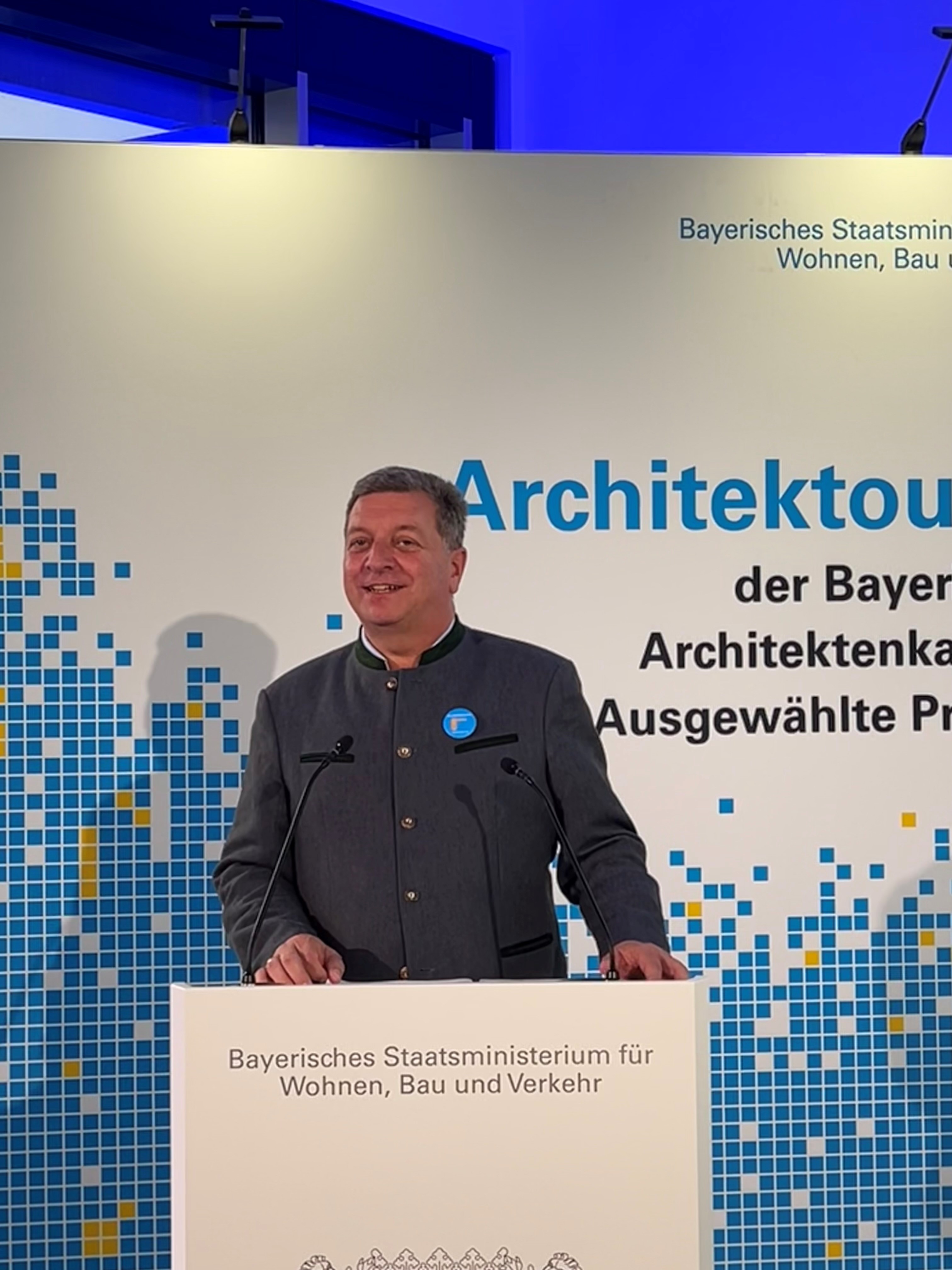 Fotos: Bayerns Bauminister Christian Bernreiter hat am Montagabend die Ausstellung zu den Architektouren 2024 im Foyer des Bauministeriums eröffnet.