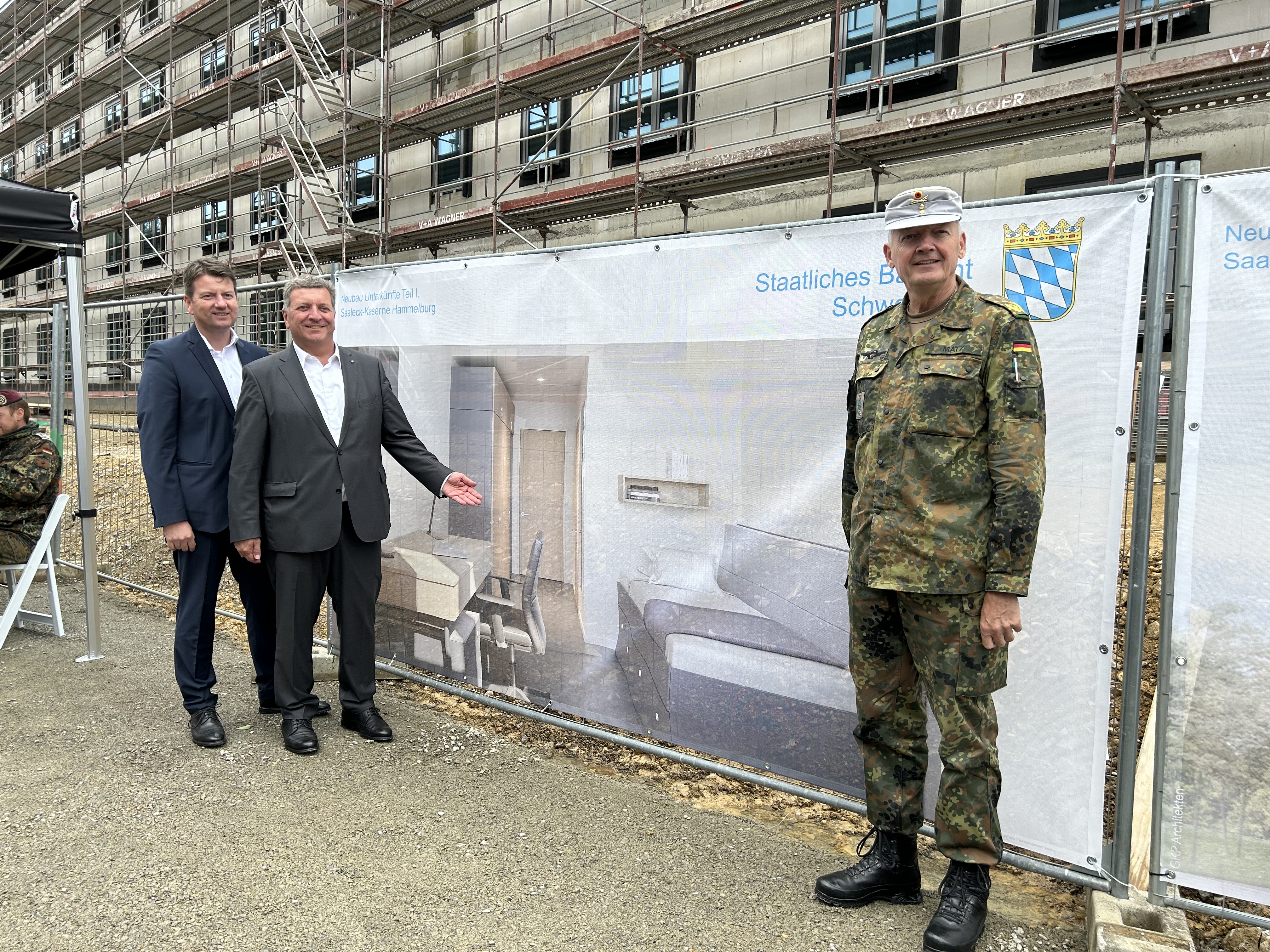 Foto: Bayerns Bauminister Christian Bernreiter (Mitte) präsentiert gemeinsam mit Innenstaatssekretär Sandro Kirchner (links) und dem Kommandeur der Infanterieschule in Hammelburg, Brigadegeneral Michael Matz (rechts), den Rohbau der Saaleck-Kaserne.