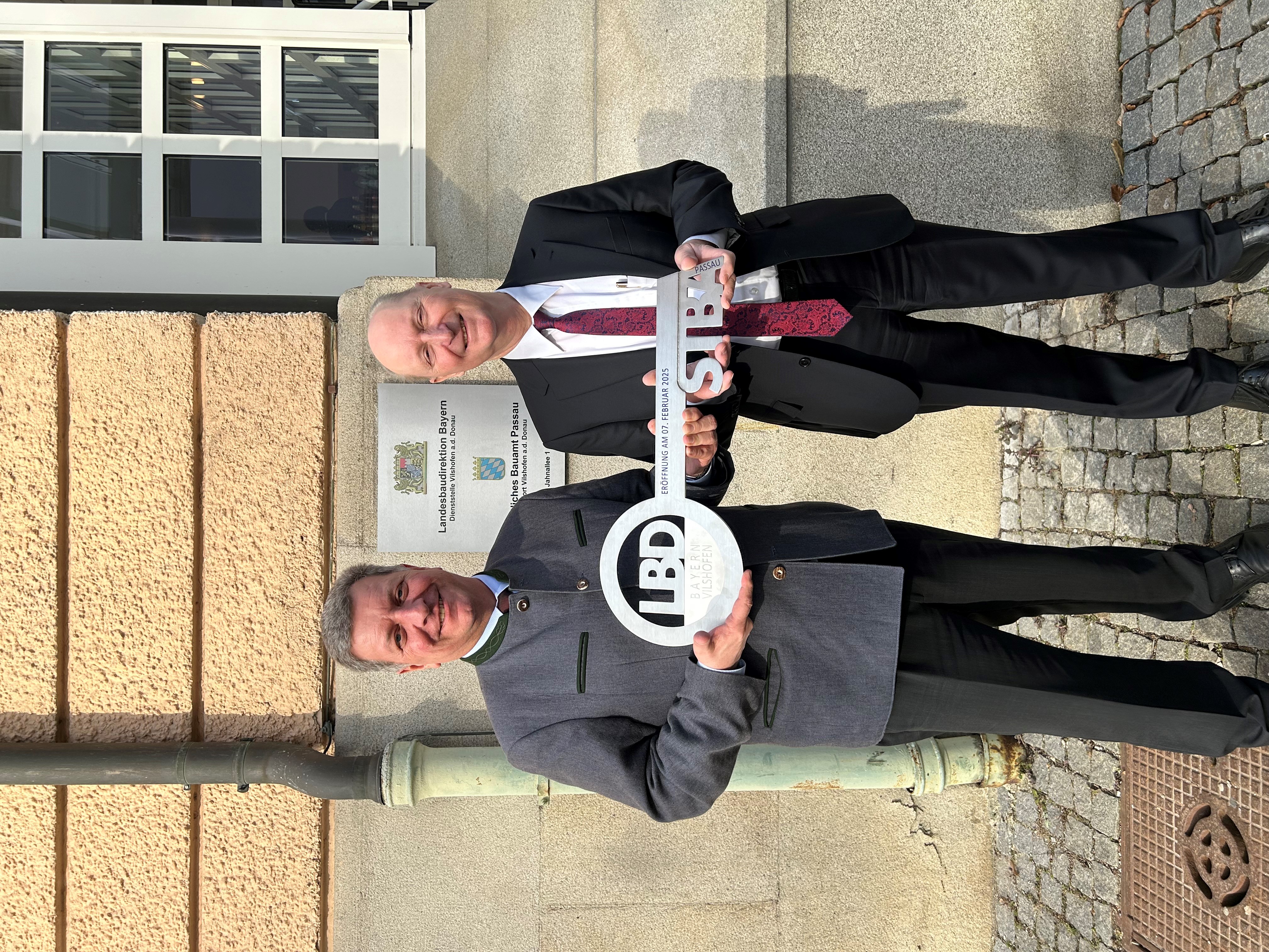 „Als zentrale Landesbehörde im Geschäftsbereich des Bayerischen Staatsministeriums für Wohnen, Bau und Verkehr nimmt die Landesbaudirektion Aufgaben rund ums Bauen für ganz Bayern wahr. Es ist aus meiner Sicht daher folgerichtig, dass wir als Behörde auch in der Fläche wahrgenommen werden. Mit dem neuen Dienstort Vilshofen sind wir neben den Standorten in Ebern, Nürnberg und München nun auch im schönen Niederbayern präsent und können damit zugleich einen weiteren Baustein zur Heimatstrategie der Bayerischen Staatsregierung beitragen“, sagte Johannes Nolte, Präsident der Landesbaudirektion Bayern. Als Geste der Gebäudeübergabe erhielt Präsident Nolte am Ende der Eröffnungsfeier von Bauminister Christian Bernreiter und Leitendem Baudirektor Norbert Sterl vom Staatlichen Bauamt Passau einen symbolischen Schlüssel für die neue Dienststelle.