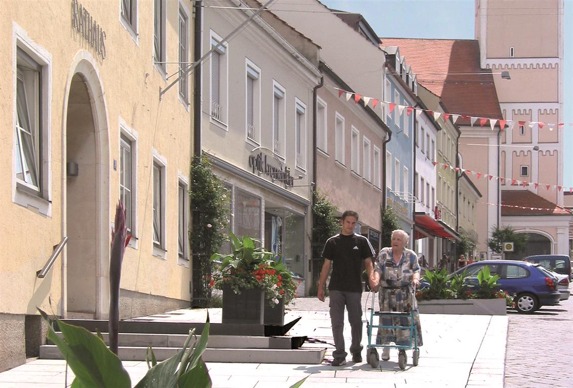 Große Teile des öffentlichen Raums - zum Beispiel Straßen, Wege und Plätze - befinden sich in der Verantwortung der Städte und Gemeinden. Mithilfe der Städtebauförderung unterstützt der Freistaat die barrierefreie Umgestaltung der Stadt- und Ortszentren sowie die barrierefreie Gestaltung von öffentlichen Gebäuden und des öffentlichen Raums, soweit sie Teil städtebaulicher Erneuerungsmaßnahmen nach dem Besonderen Städtebaurecht sind. Denn es ist eine wichtige Zielvorgabe der Städtebauförderung, dass unsere Städte, Märkte und Gemeinden für alle Menschen nutzbar sind.