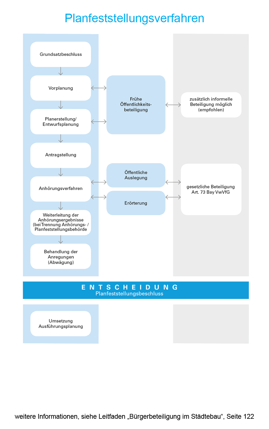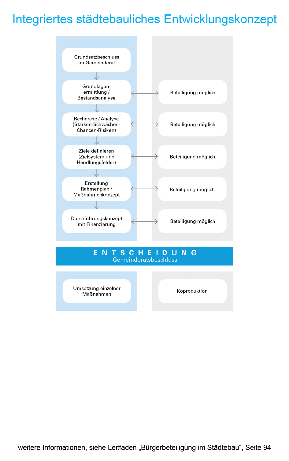 Diese Seite gibt eine erste Orientierung. Für die Erarbeitung Ihres individuellen Beteiligungskonzepts empfehlen wir den Leitfaden „Bürgerbeteiligung im Städtebau“ (kostenloser Download siehe 'Downloads', Printfassung im Bestellportal der Bayerischen Staatsregierung).